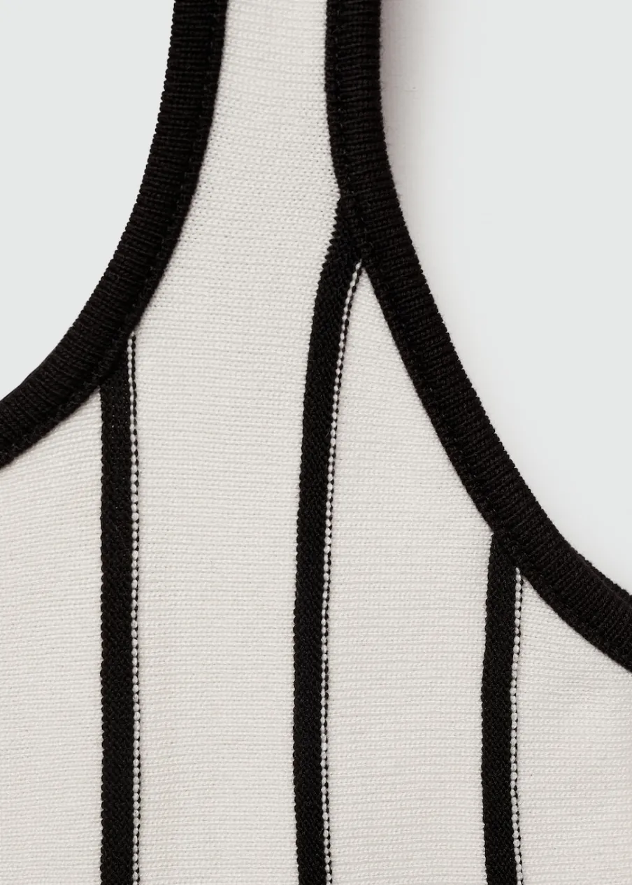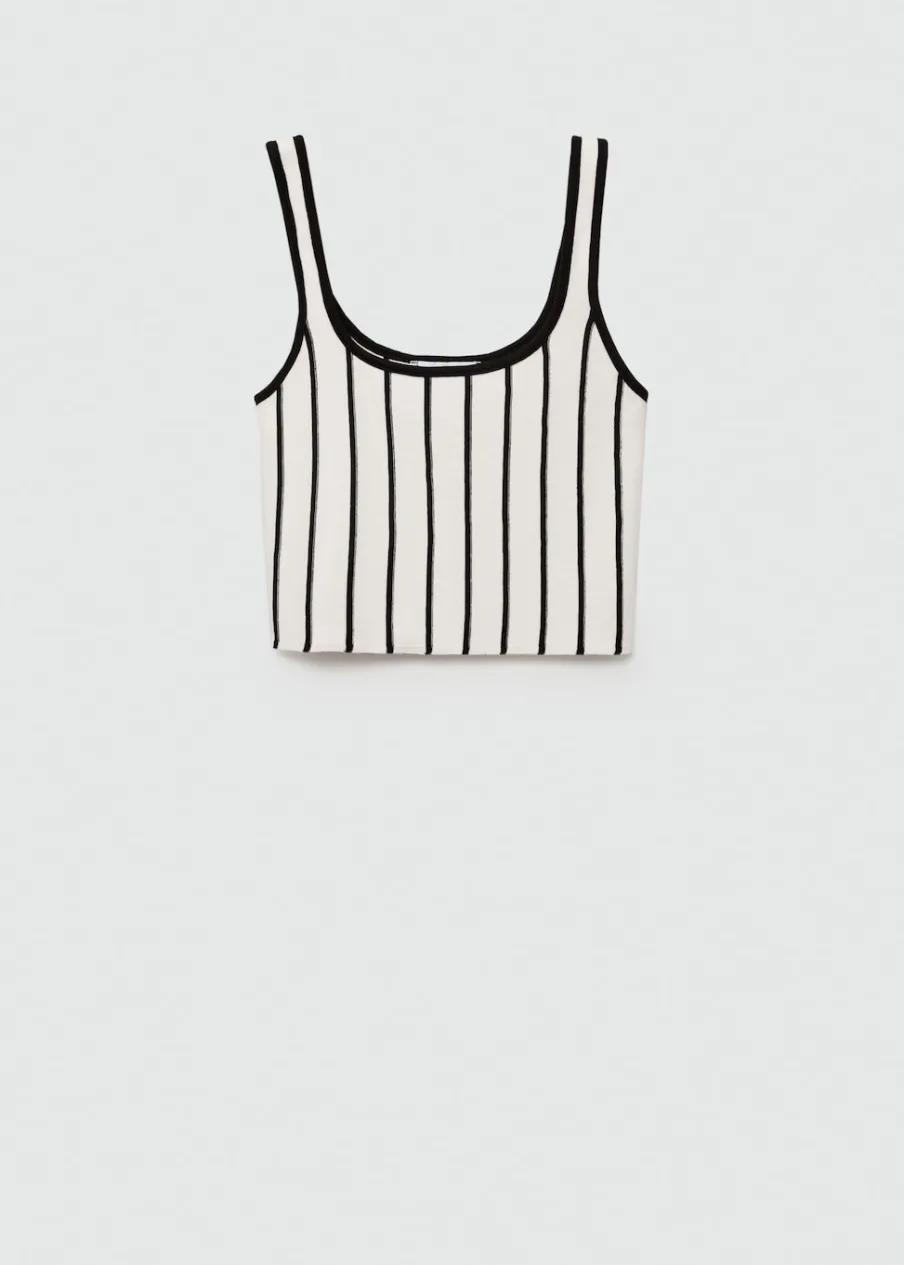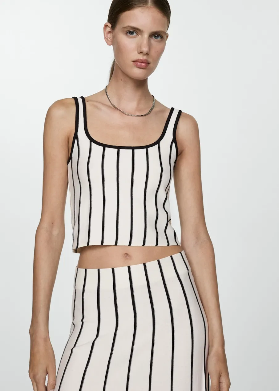 Dzianinowa tkanina. Deseń crop. Dekolt. Bez rękawów. Cienkie ramiączka. Modelka ma 180 cm wzrostu i nosi rozmiar S. Wzór w paski. Model wcięty.