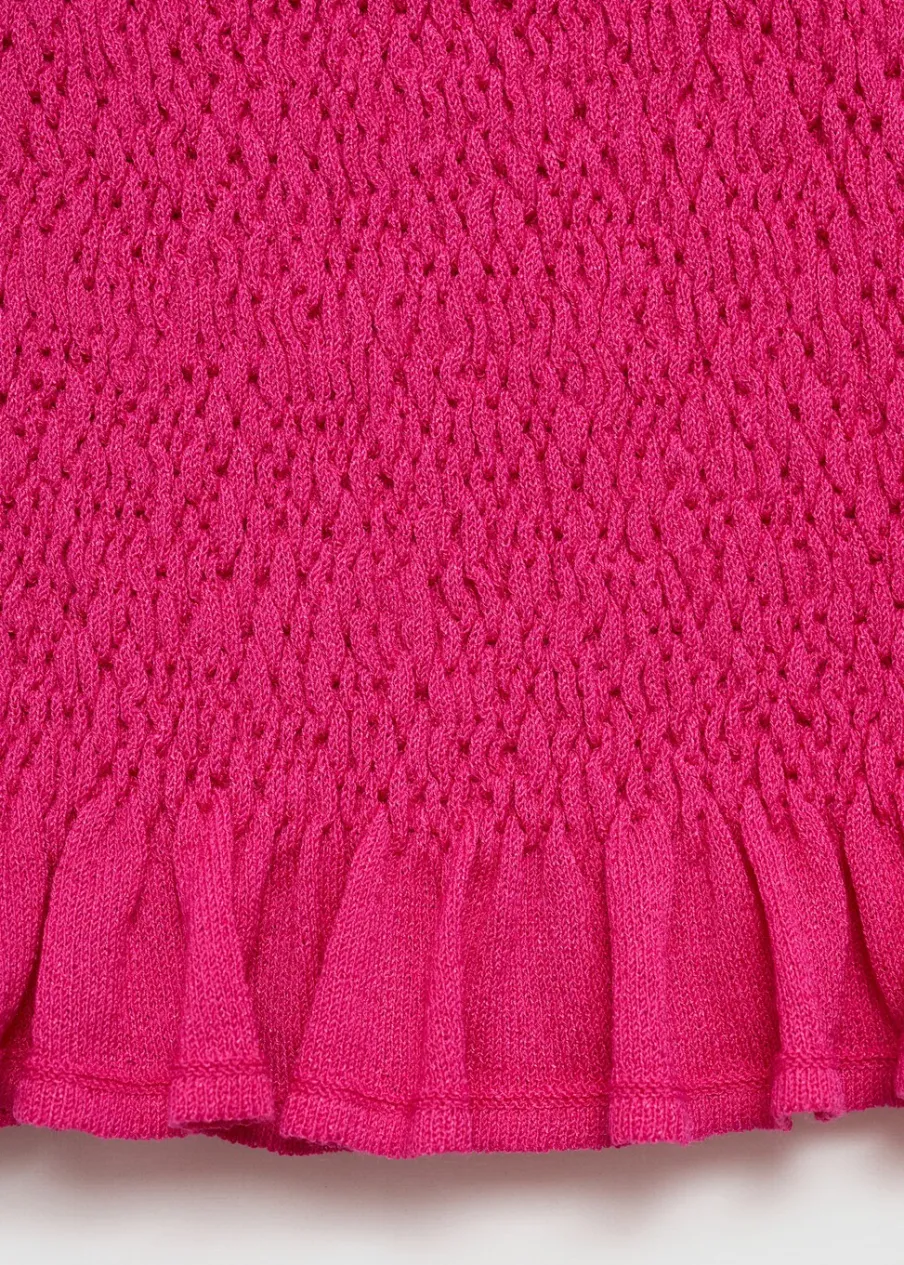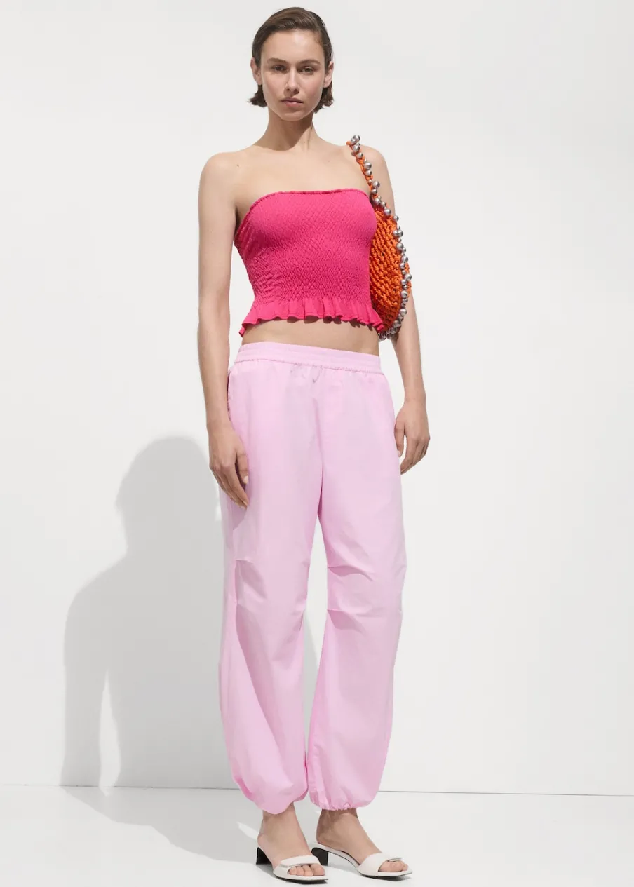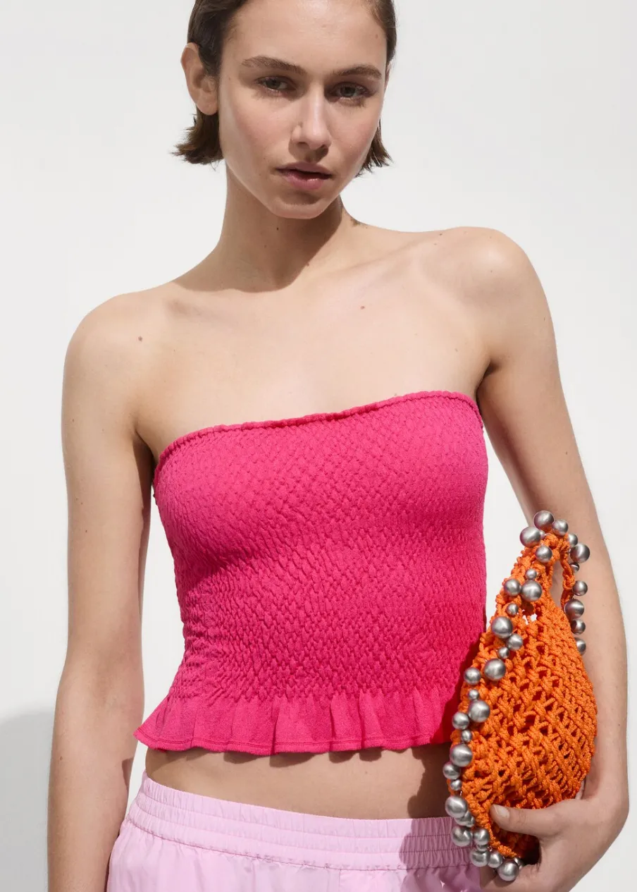 Marszczona tkanina. Dzianina średniej grubości. Deseń crop. Dekolt bez ramiączek. Bez rękawów. Detal z falbaną. Total look.