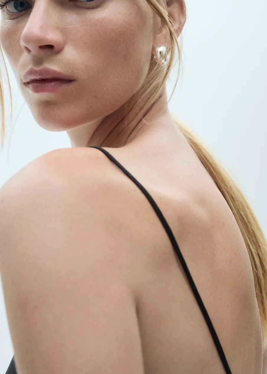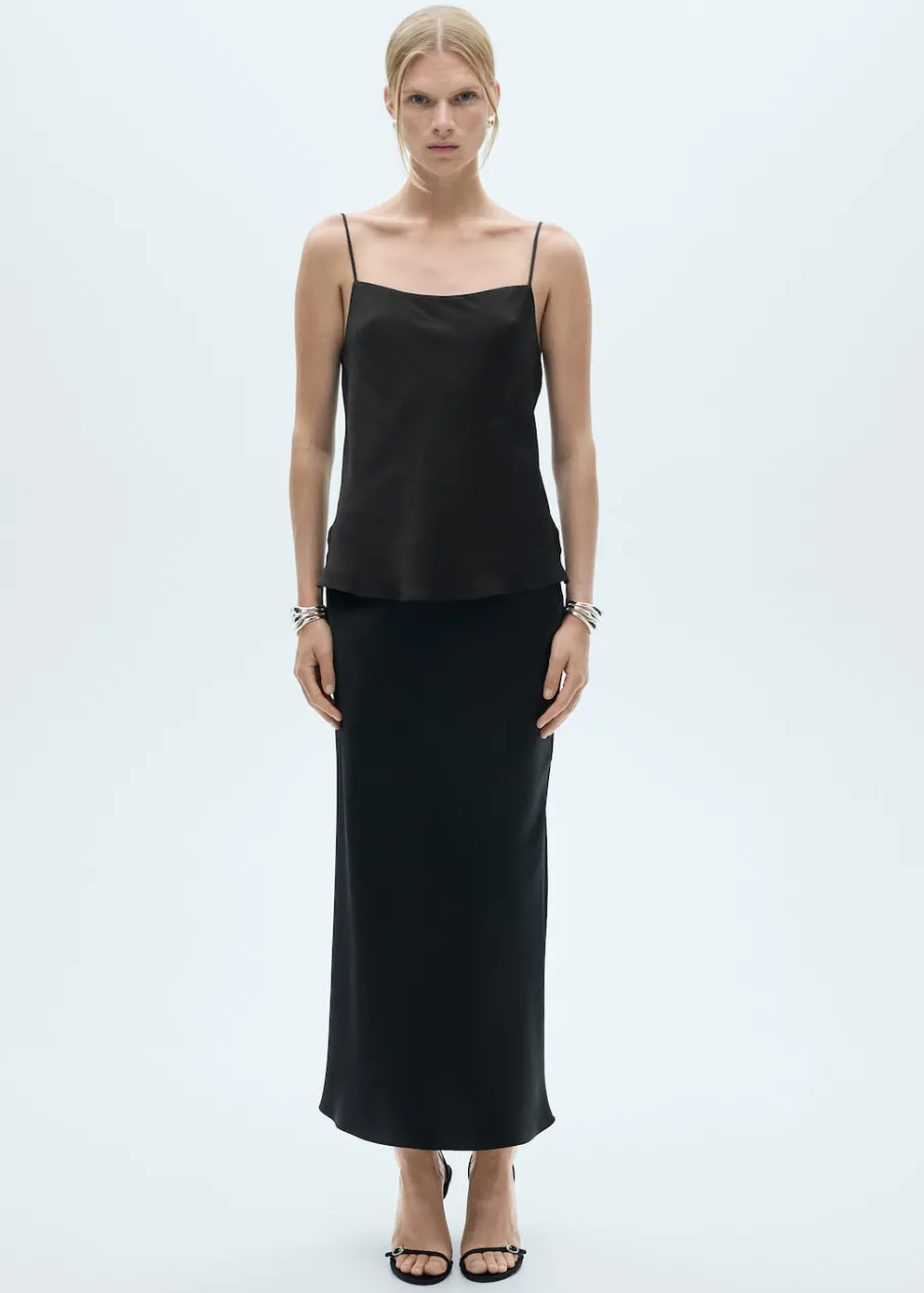 Dekolt. Cienkie ramiączka. Model prosty. Bez zapięcia. Modelka ma 178 cm wzrostu i nosi rozmiar S/36. Satynowa tkanina. Bez rękawów.