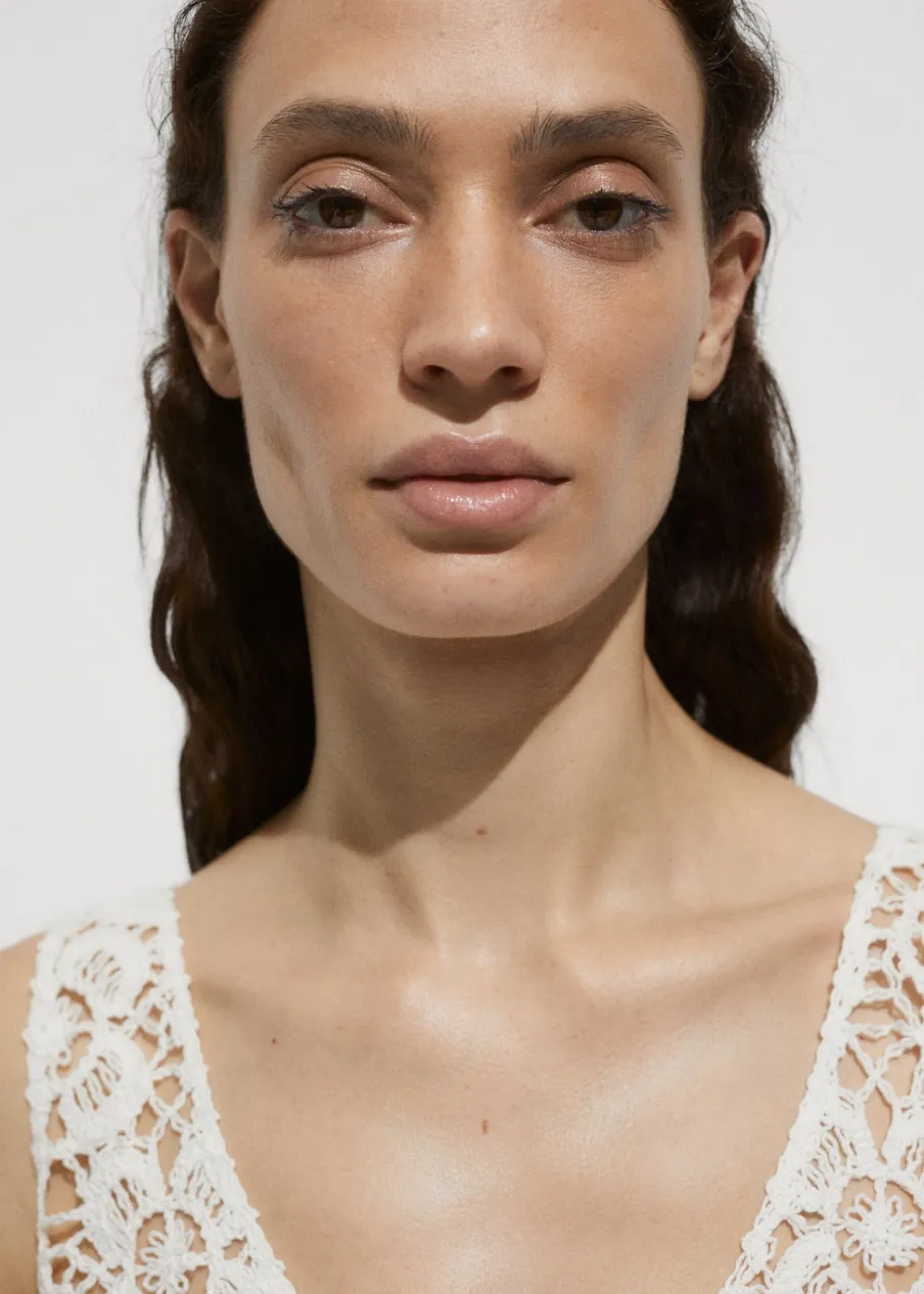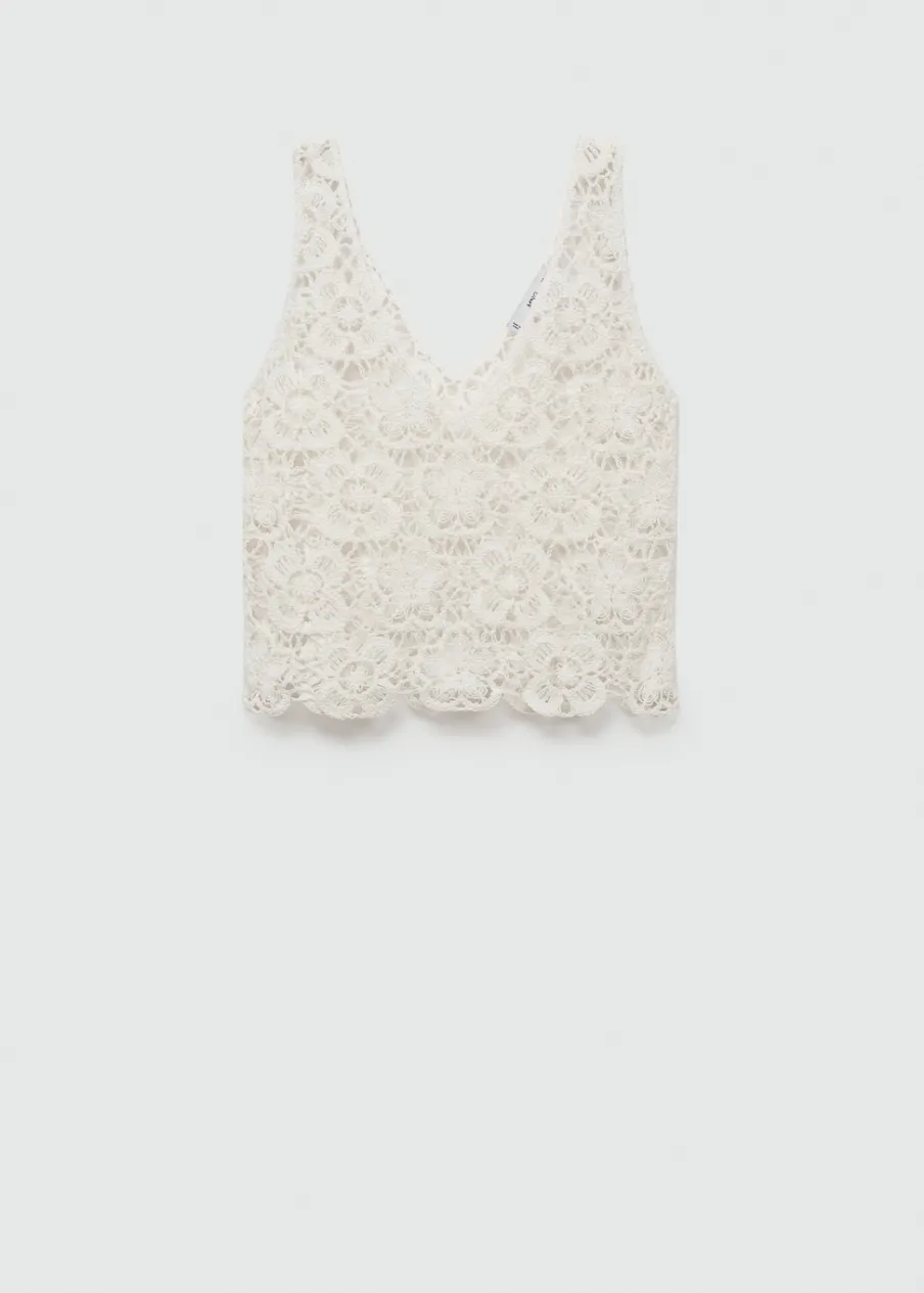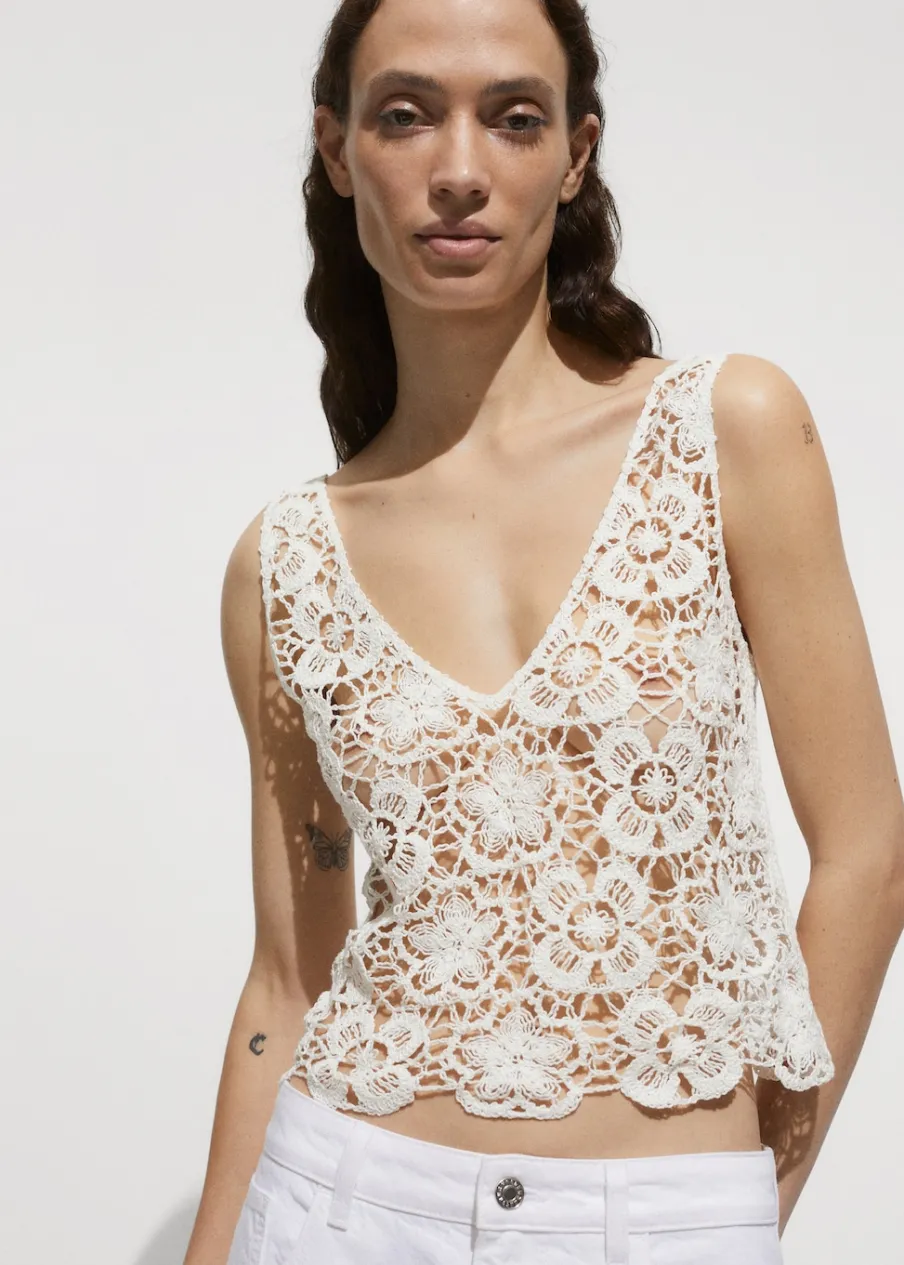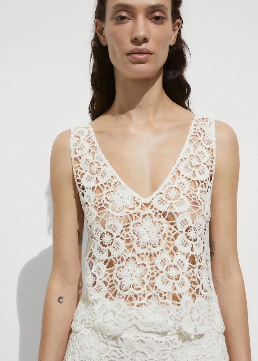 Tkanina mieszanka bawełny. Model prosty. Deseń w kwiaty. Półprzezroczysty design. Dekolt V. Bez rękawów. Szerokie ramiączka. Bez zapięcia. Total look. Szydełkowa tkanina.