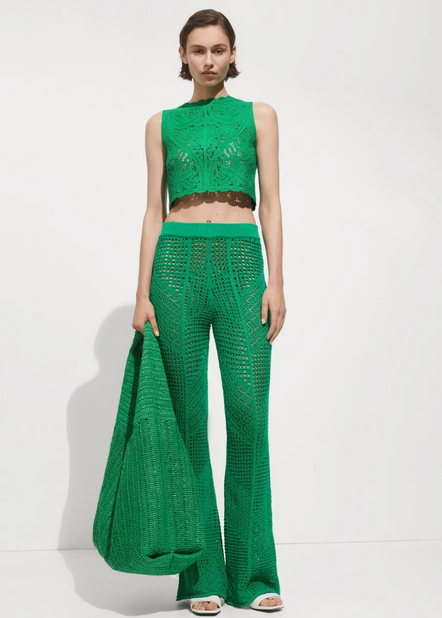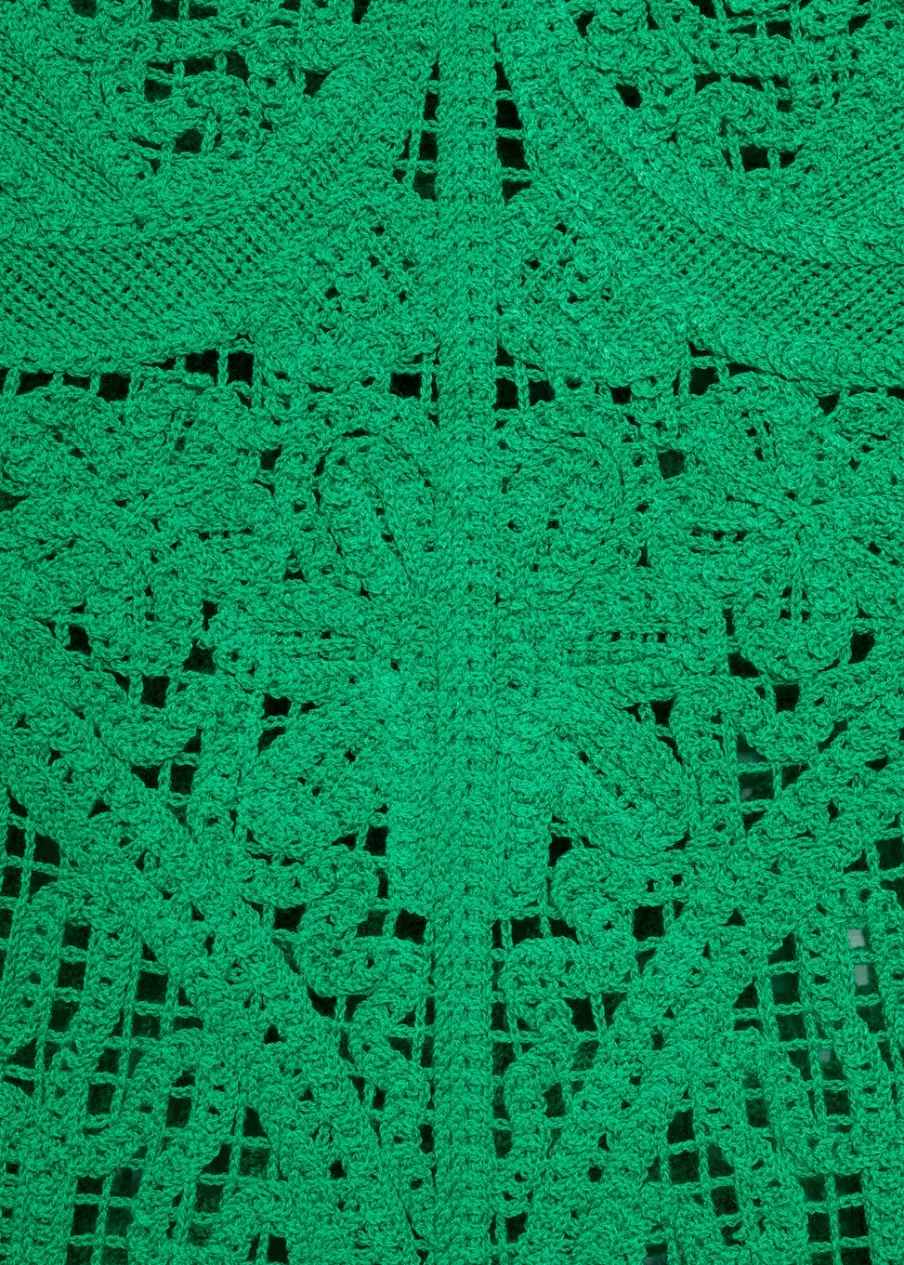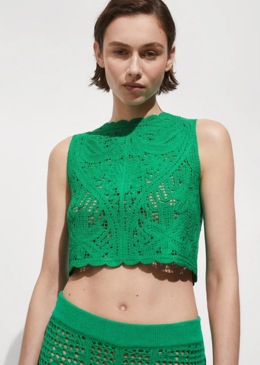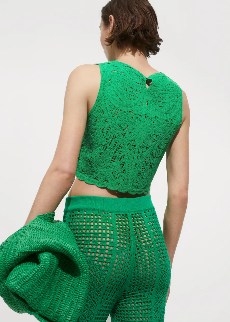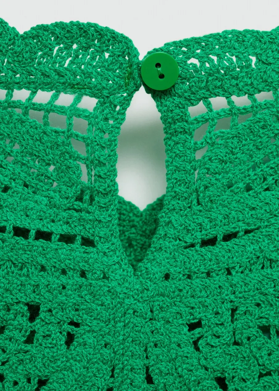 Tkanina z grubej dzianiny. Deseń crop. Model prosty. Okrągły dekolt. Bez rękawów. Szerokie ramiączka. Zapięcie na guzik z tyłu. Szydełkowa tkanina.