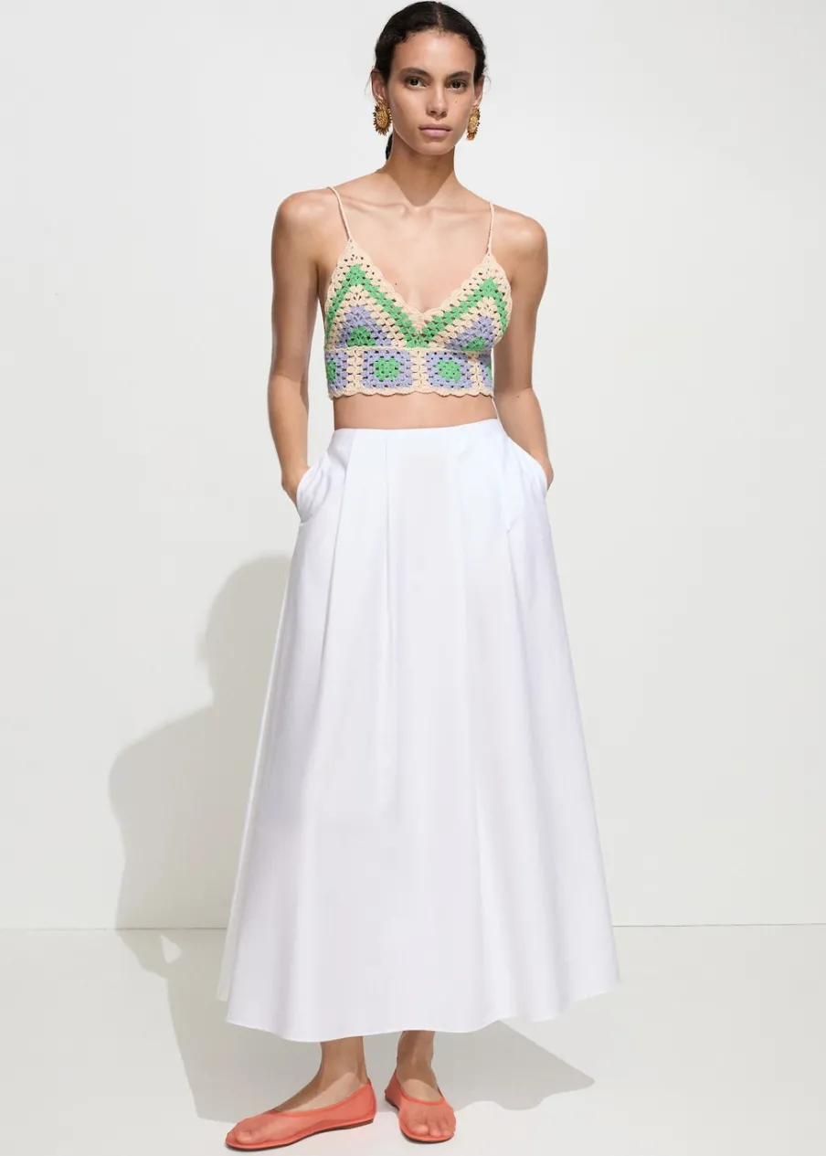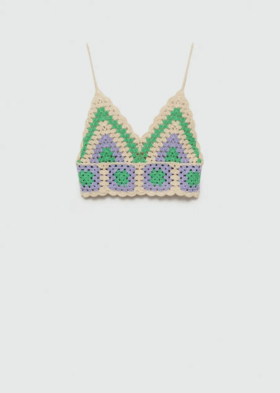Tkanina z grubej dzianiny. Deseń crop. Model łączony. Dekolt V. Bez rękawów. Cienkie ramiączka. Model wcięty. Szydełkowa tkanina. Tkanina z 100% bawełny.