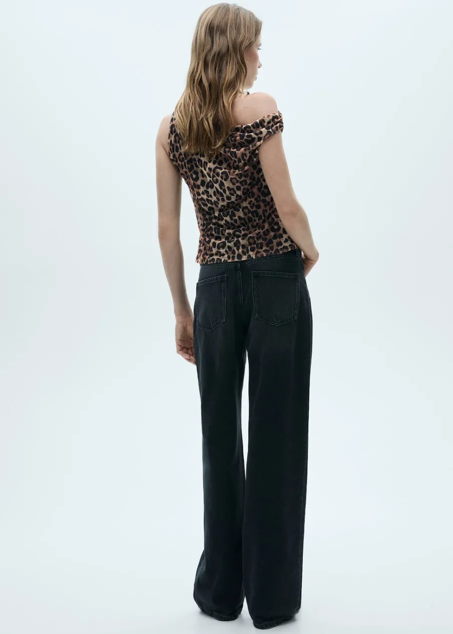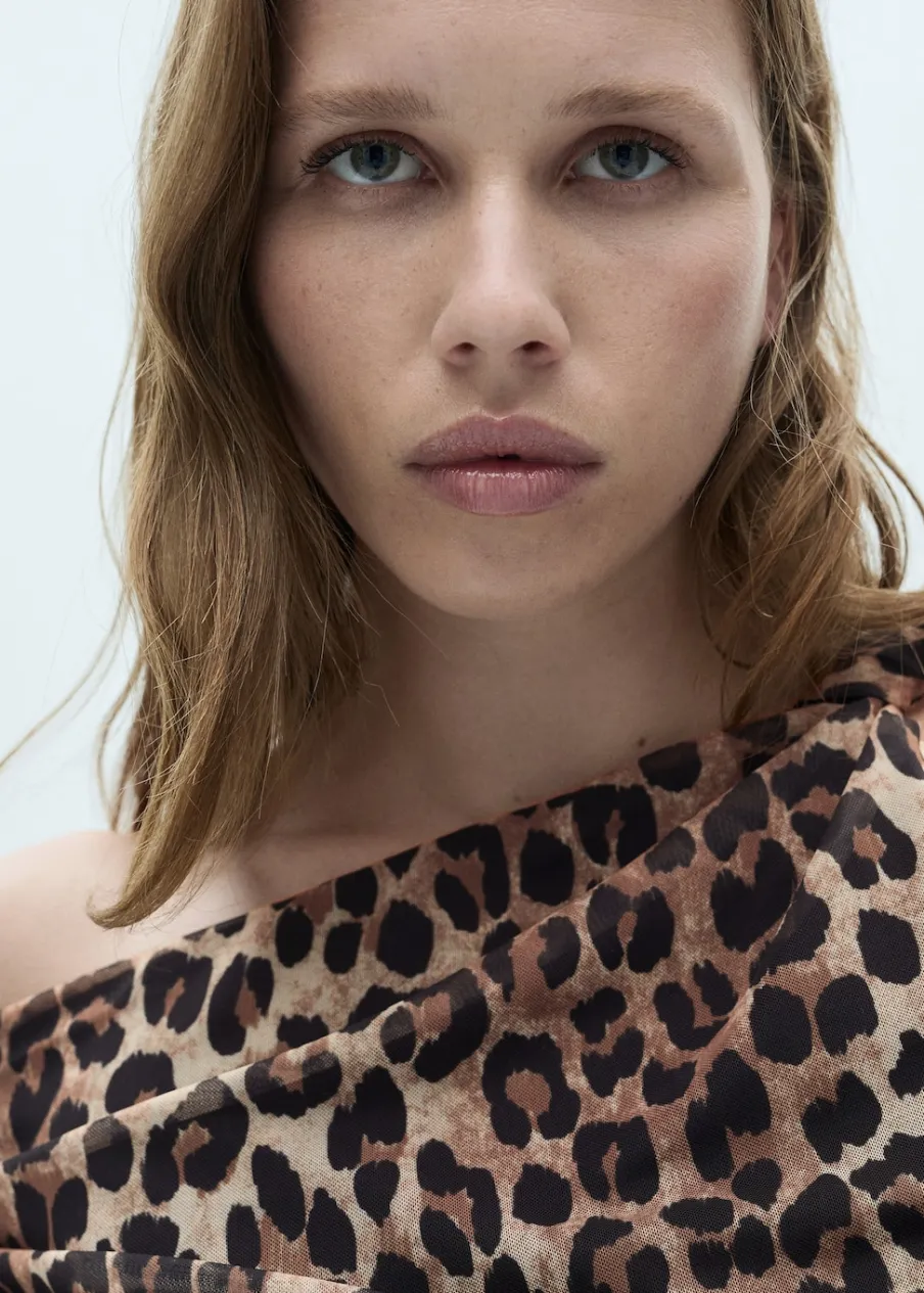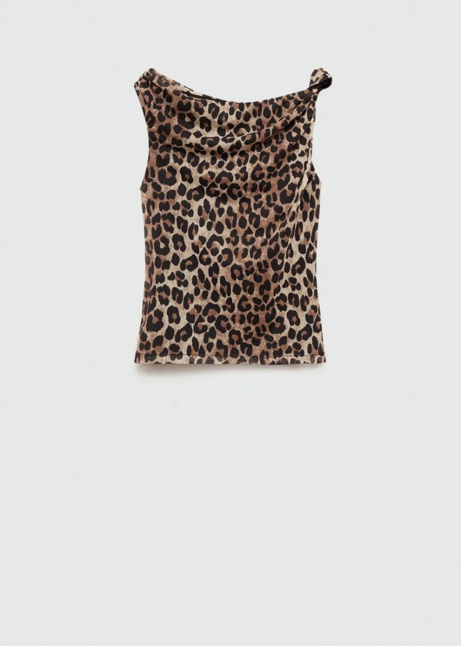 Lejąca tkanina. Model prosty. Wzór w lamparcie cętki. Asymetryczny krój. Zwierzęcy wzór. Bez rękawów. Szerokie ramiączka. Modelka ma 175 cm wzrostu i nosi rozmiar S/36. Model wcięty.