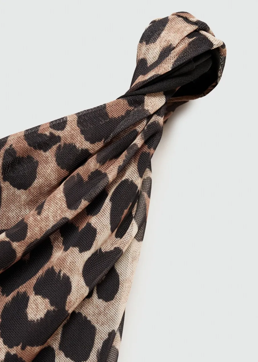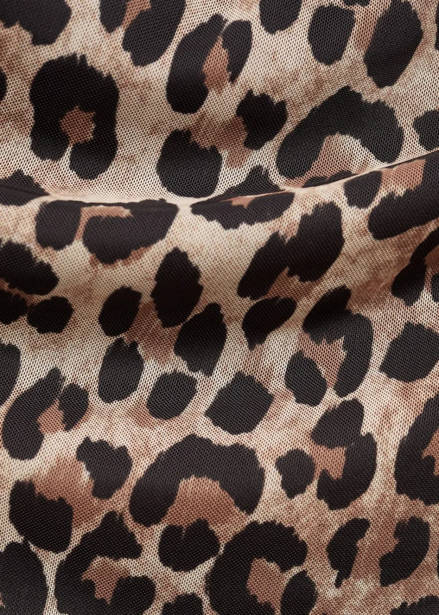 OpisLejąca tkanina. Model prosty. Wzór w lamparcie cętki. Asymetryczny krój. Zwierzęcy wzór. Bez rękawów. Szerok…