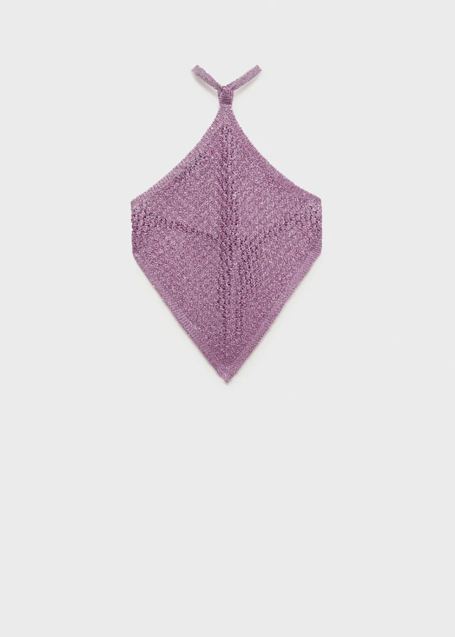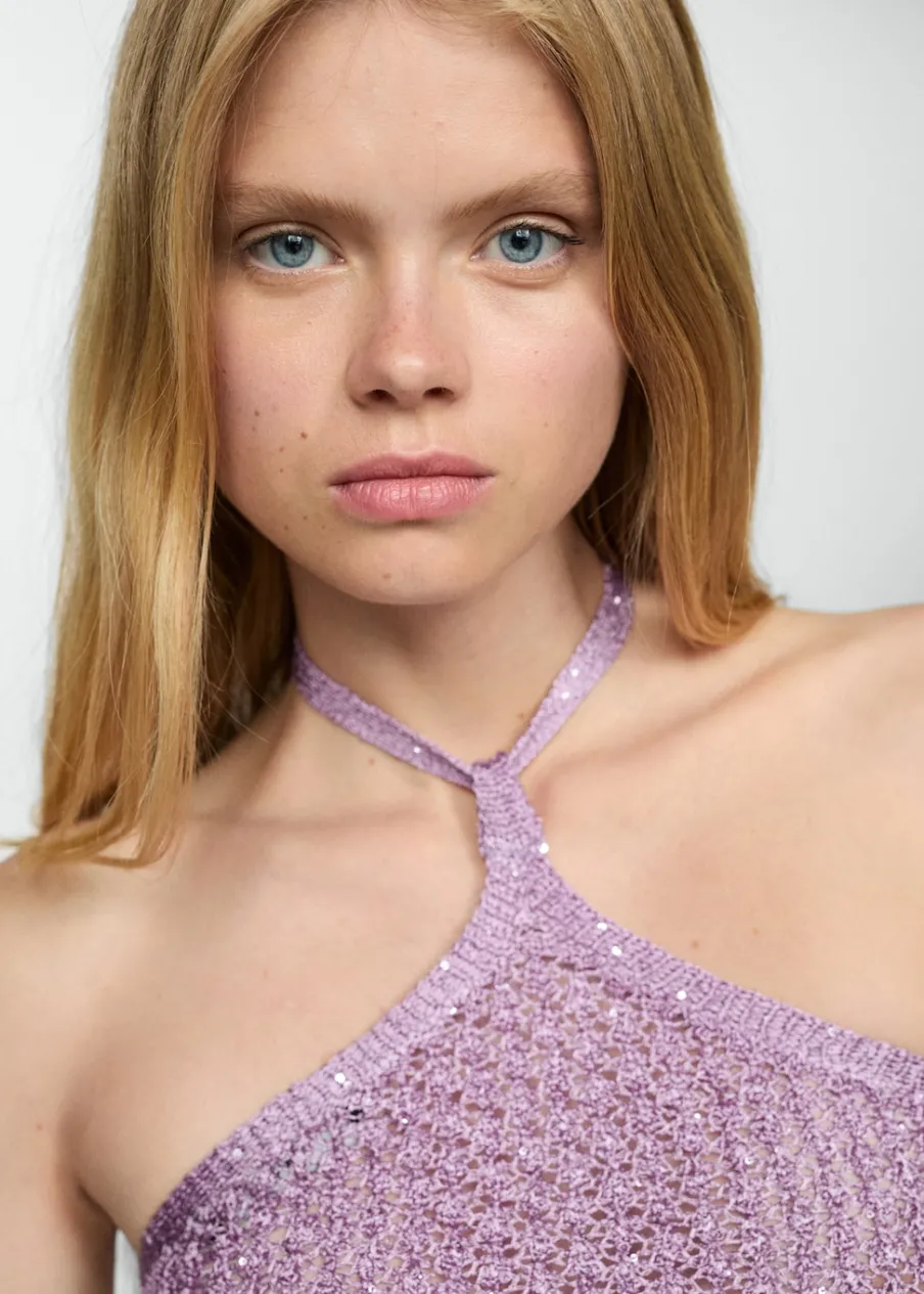 Tkanina z grubej dzianiny. Tkanina z cekinami. Asymetryczny krój. Deseń crop. Dekolt w stylu halter. Bez rękawów. Wiązanie na plecach. Ozdobny węzeł. Total look. Model wcięty.