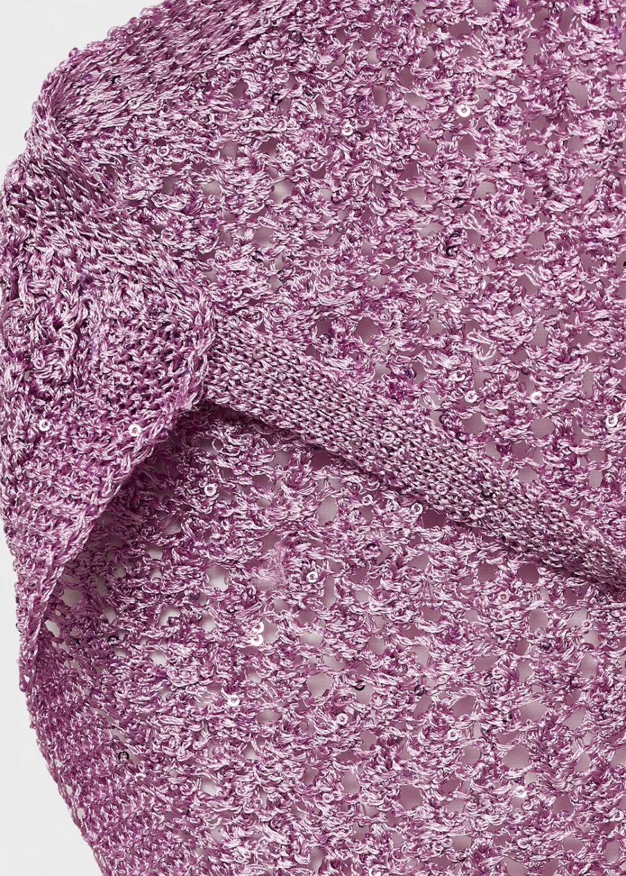 OpisTkanina z grubej dzianiny. Tkanina z cekinami. Asymetryczny krój. Deseń crop. Dekolt w stylu halter. Bez rękawów…