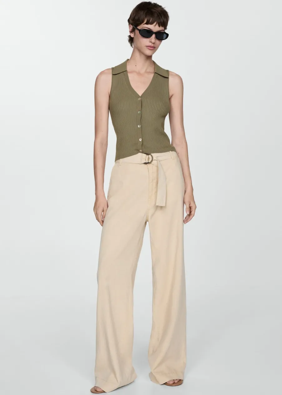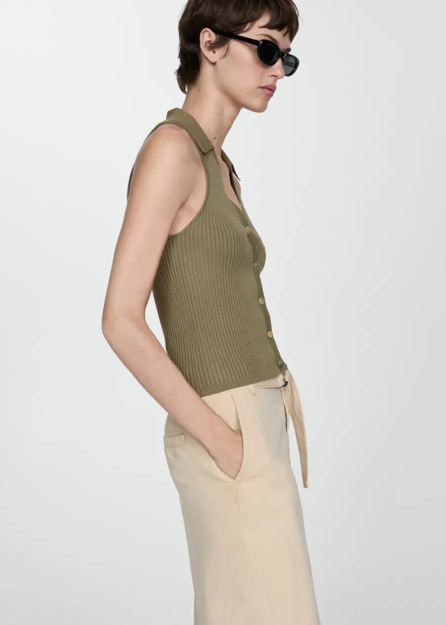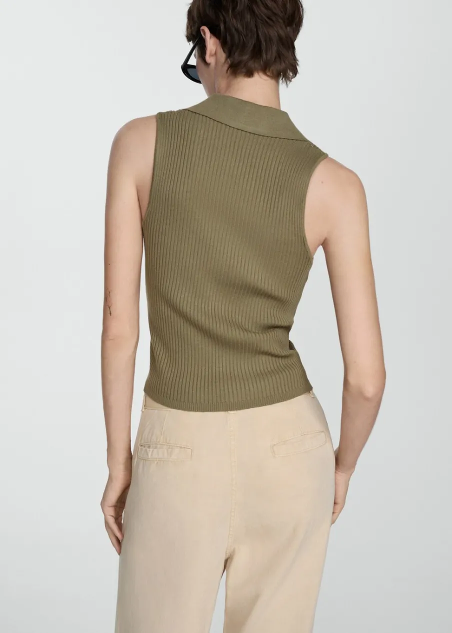 OpisTkanina z cienkiej dzianiny. Ściągaczowa tkanina. Model prosty. Kołnierzyk polo. Bez rękawów. Szerokie ramiącz…