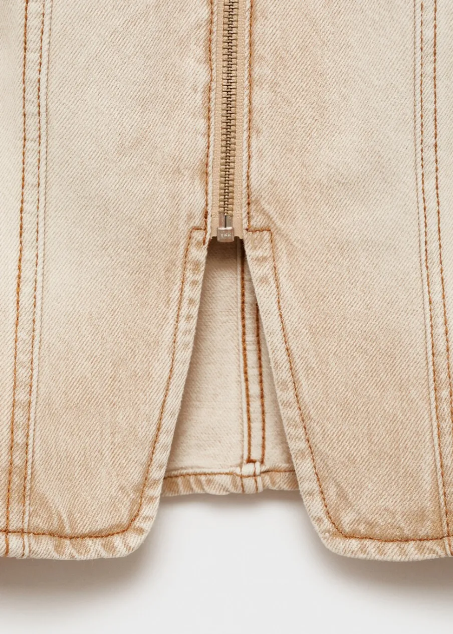 Tkanina bawełniana w dżinsowym stylu. Deseń crop. Okrągły dekolt. Bez rękawów. Zapięcie na zamek z przodu. Ozdobne szwy. Total look. Model wcięty.