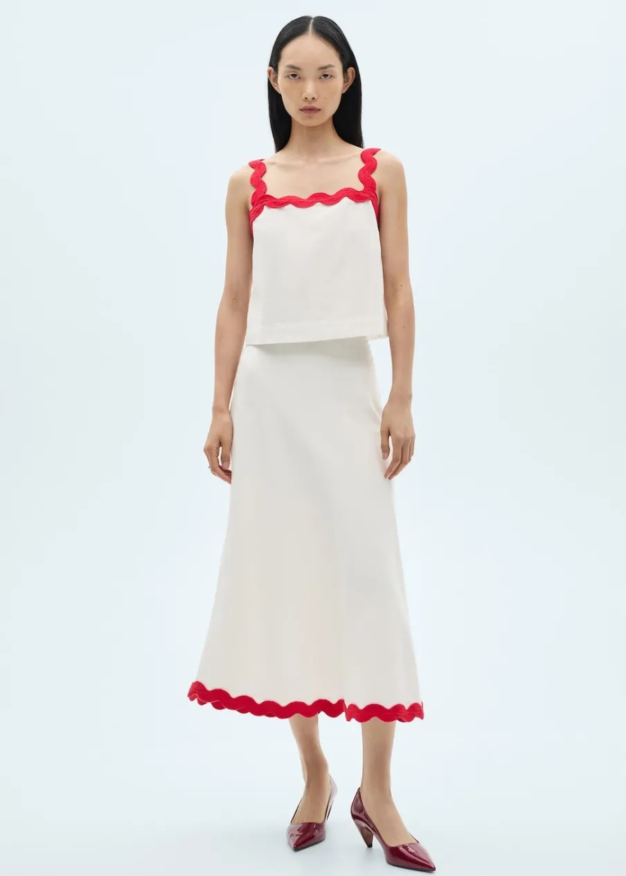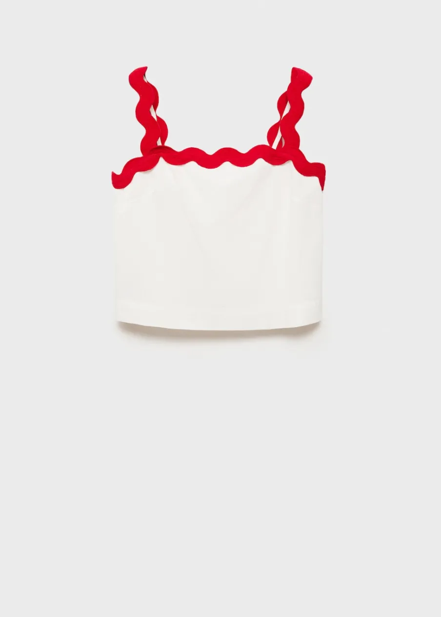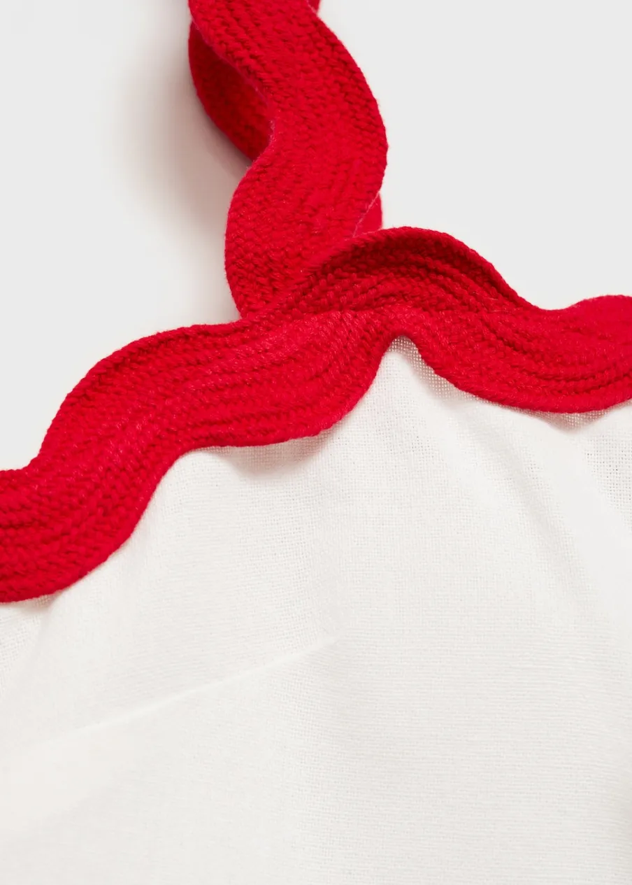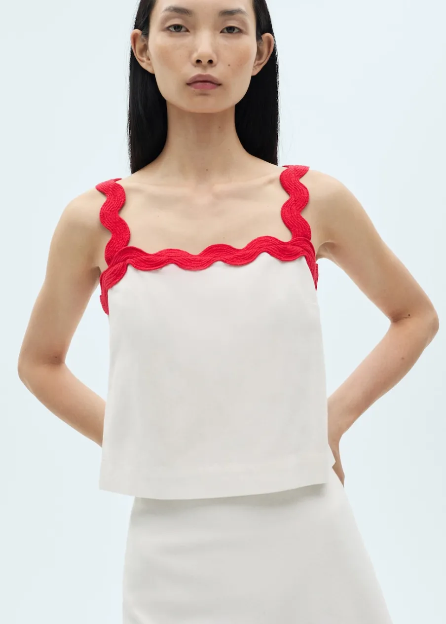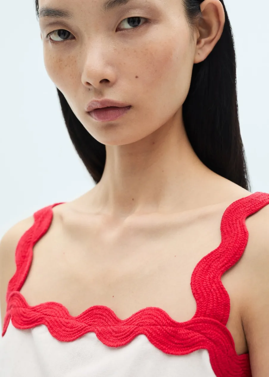 Bawełna 100%. Cienka tkanina. Model prosty. Dekolt. Bez rękawów. Szerokie ramiączka. Kontrastowe wykończenia. Bez zapięcia.