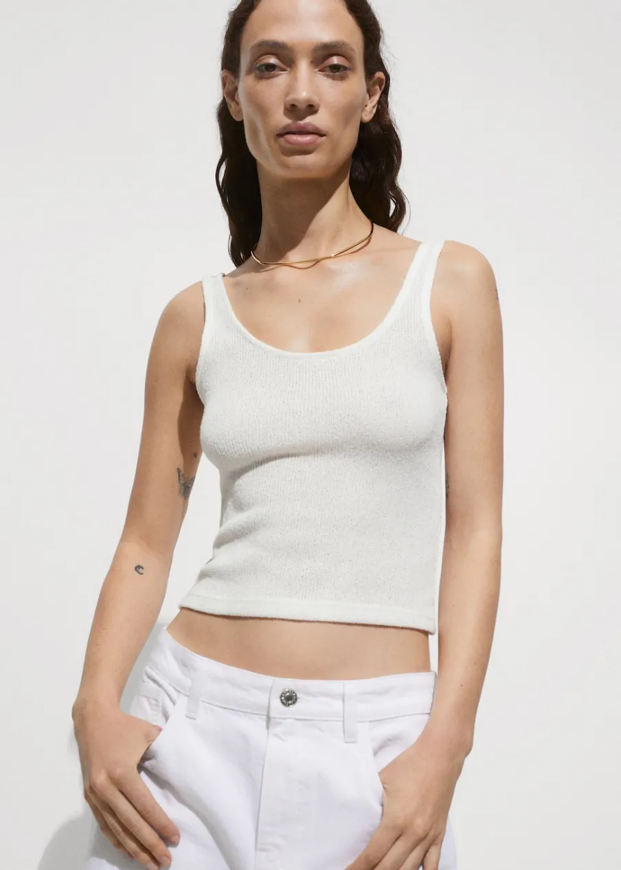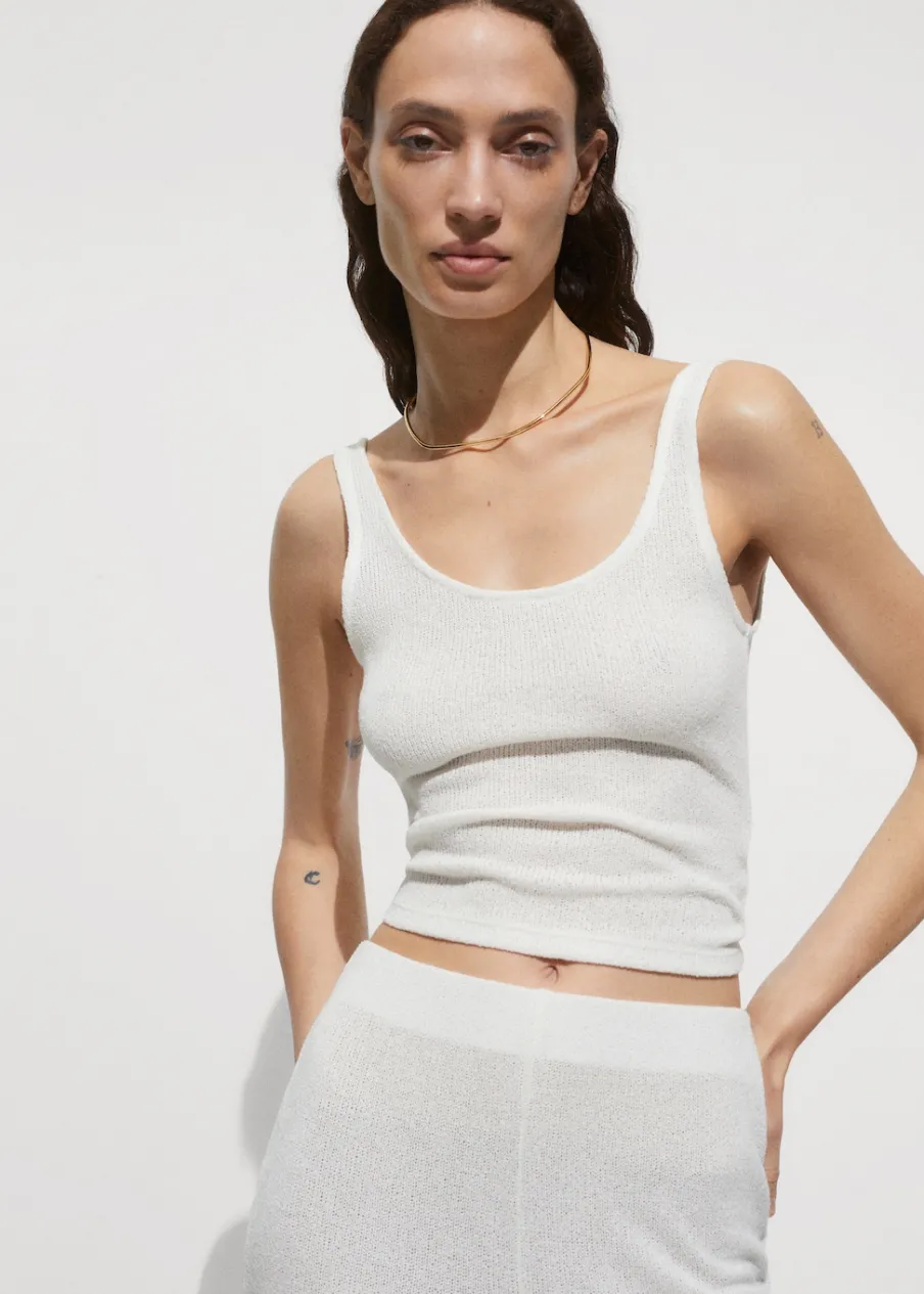 OpisTkanina z cienkiej dzianiny. Półprzezroczysta tkanina. Deseń crop. Okrągły dekolt. Bez rękawów. Szerokie rami…