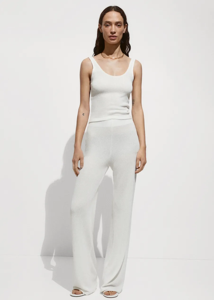 Tkanina z cienkiej dzianiny. Półprzezroczysta tkanina. Deseń crop. Okrągły dekolt. Bez rękawów. Szerokie ramiączka. Total look. Model wcięty.