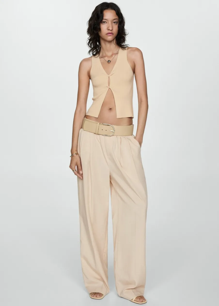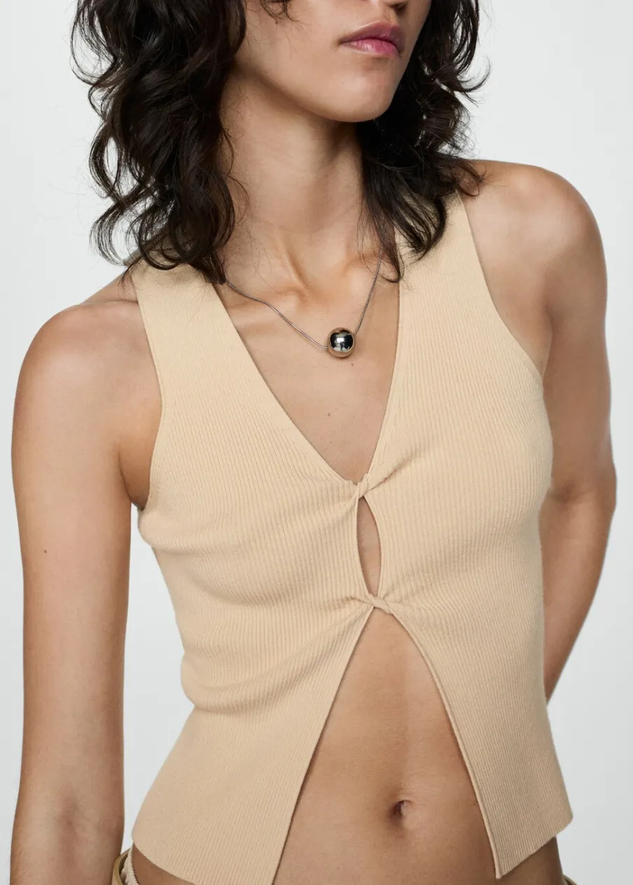 Tkanina z cienkiej dzianiny. Model prosty. Dekolt V. Bez rękawów. Szerokie ramiączka. Kopertowy element. Detal z rozcięciem. Model wcięty.