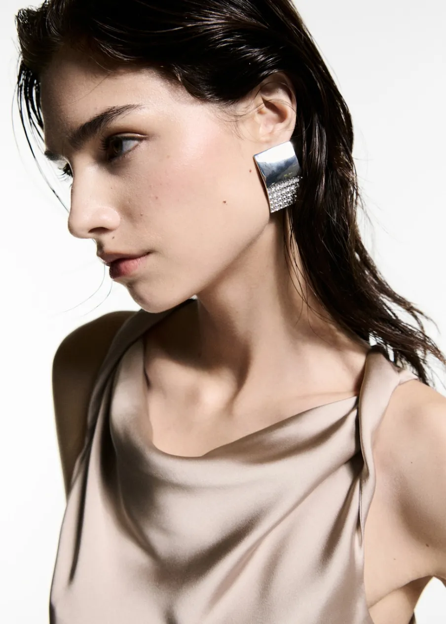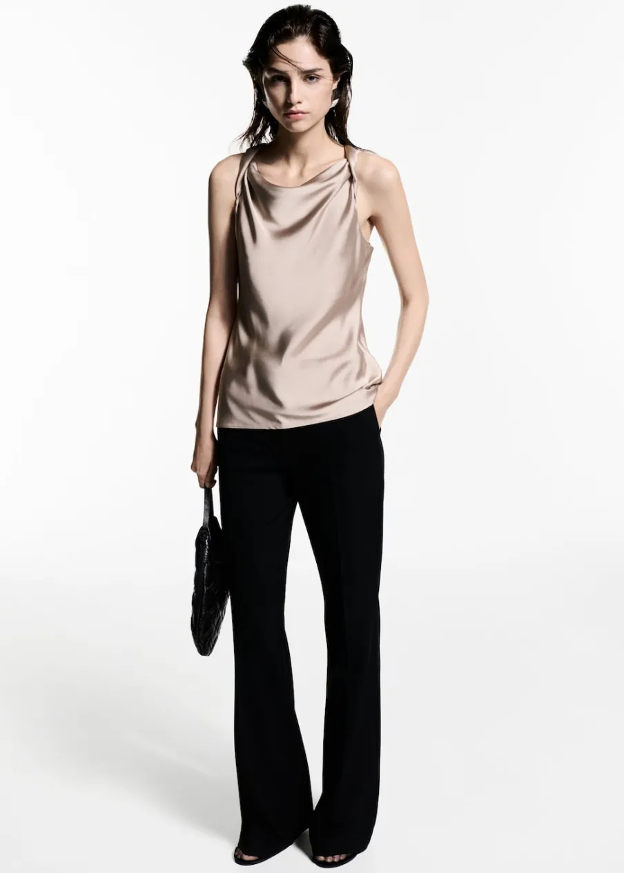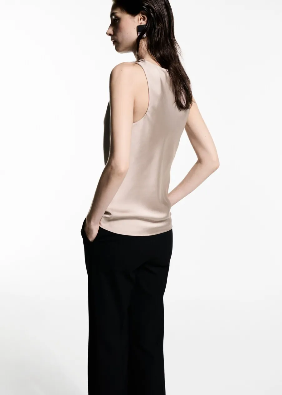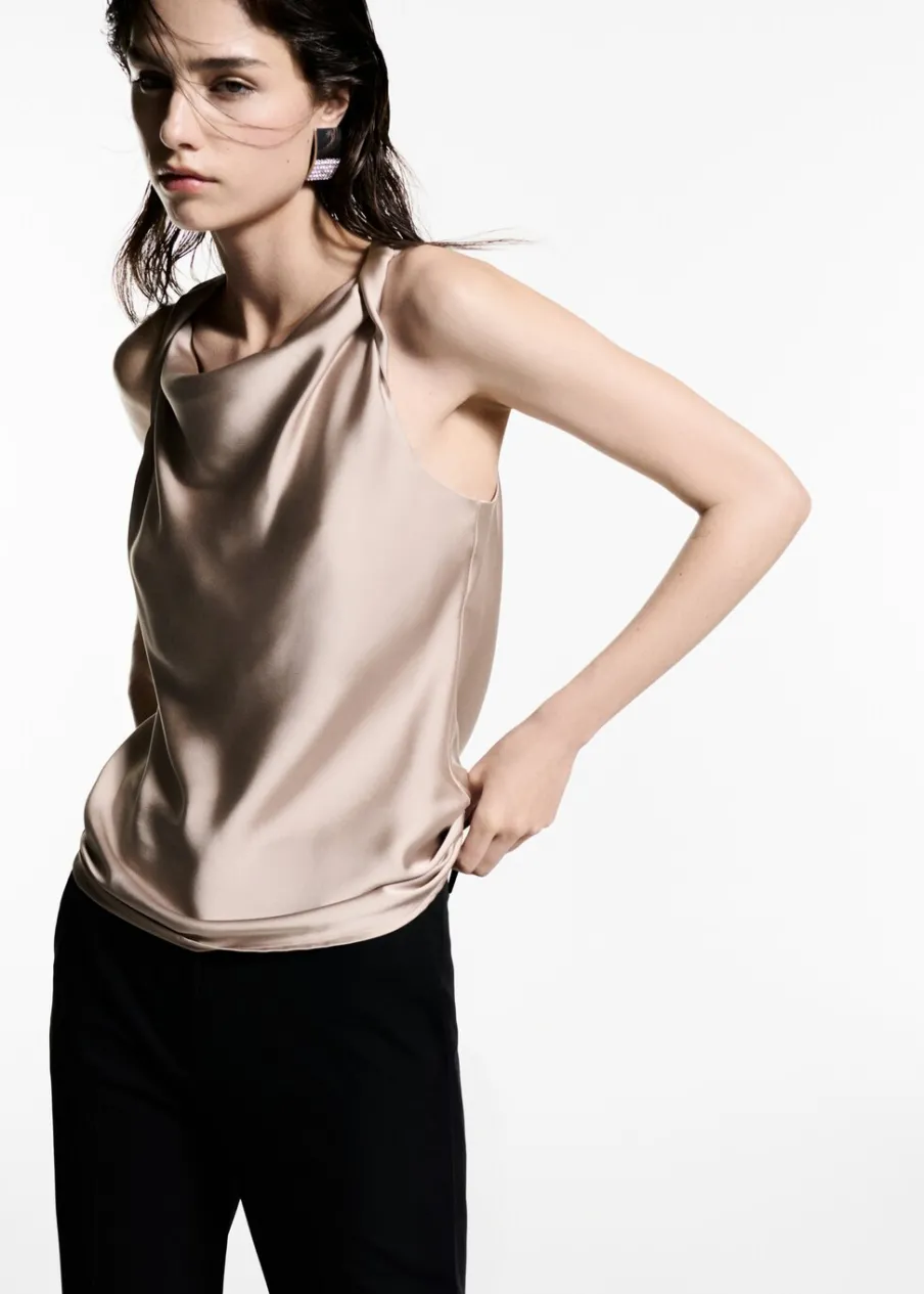 Satynowa tkanina. Model prosty. Drapowany dekolt. Szerokie ramiączka. Bez rękawów. Bez zapięcia. Kolekcja wizytowa. Modelka ma 177 cm wzrostu i nosi rozmiar S/36.
