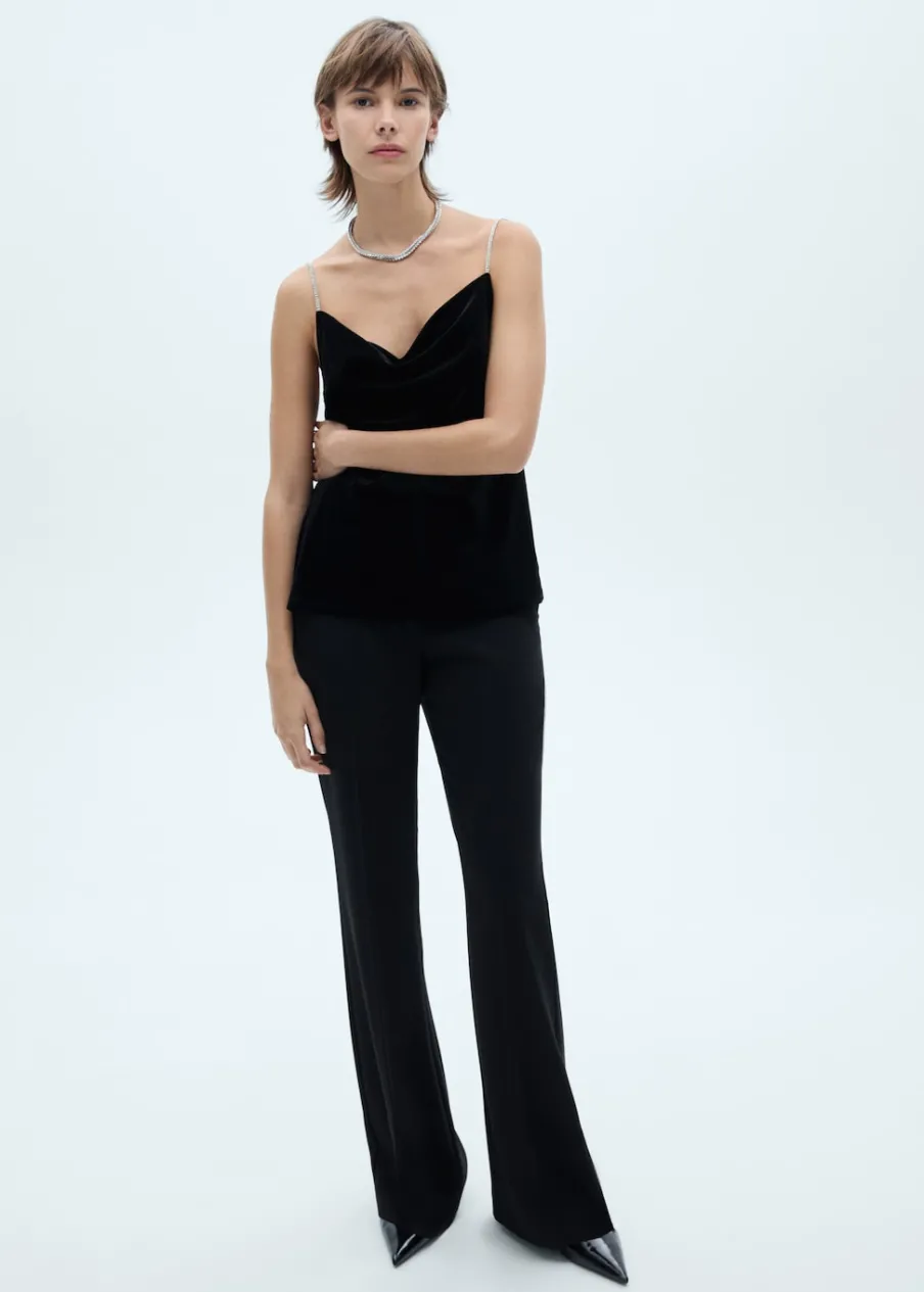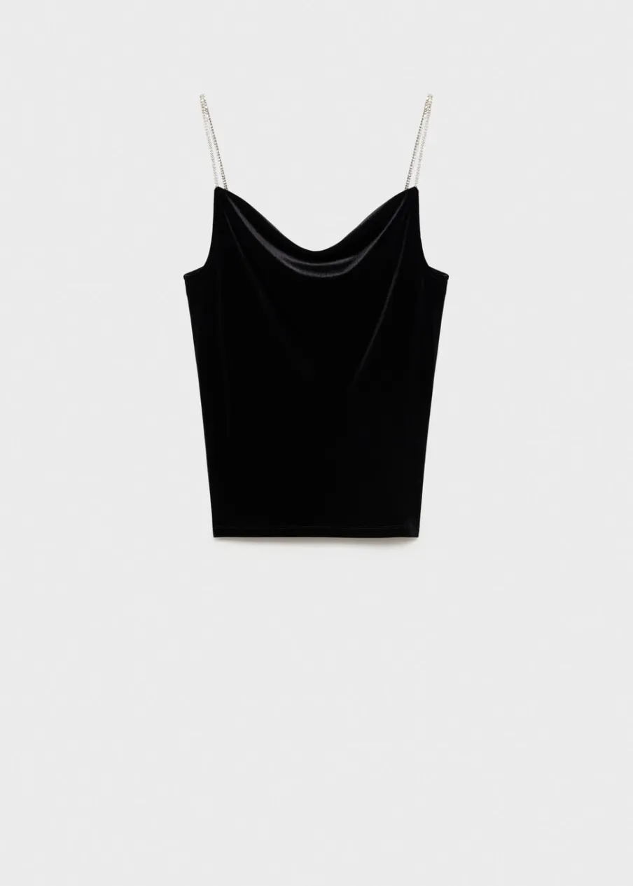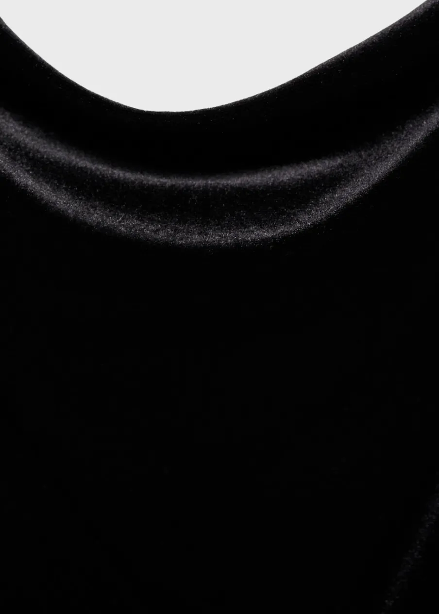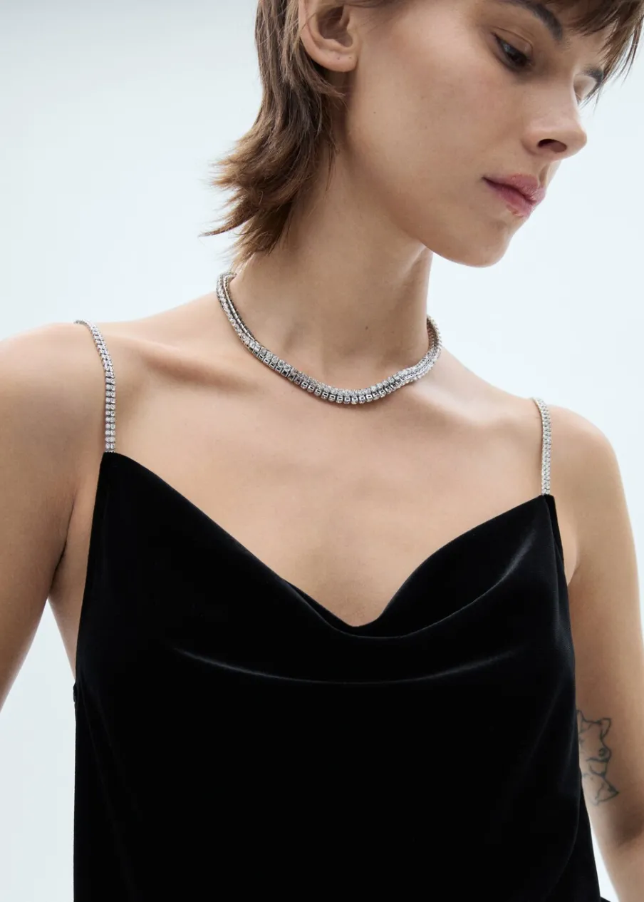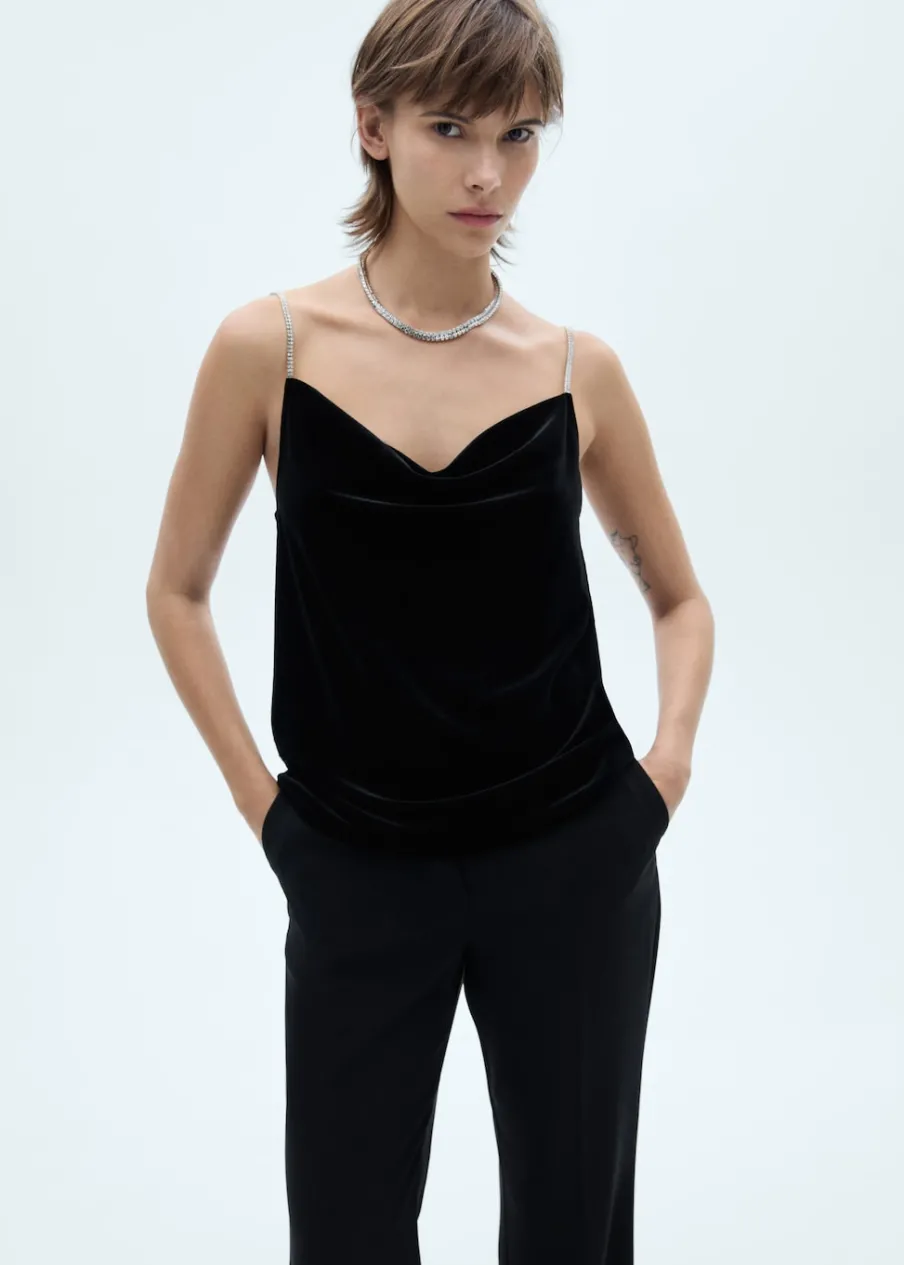 Aksamitna tkanina. Model prosty. Model z drapowaniem. Dekolt. Cienkie ramiączka. Detal strass. Kolekcja wizytowa. Modelka ma 175 cm wzrostu i nosi rozmiar S/36.