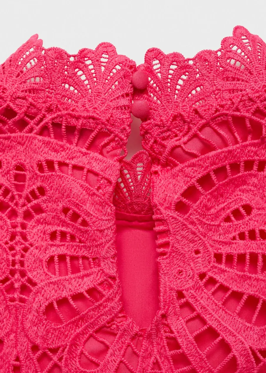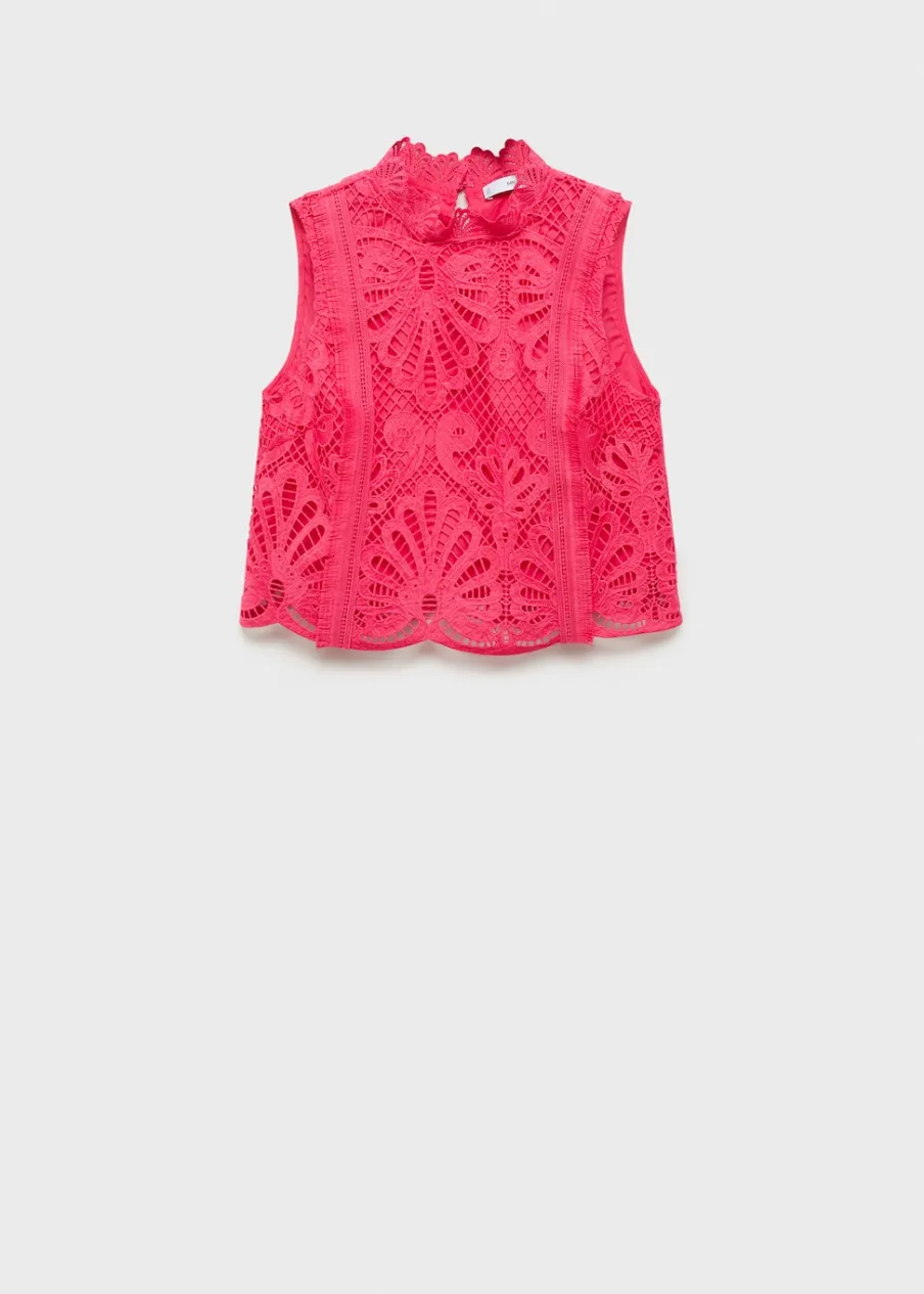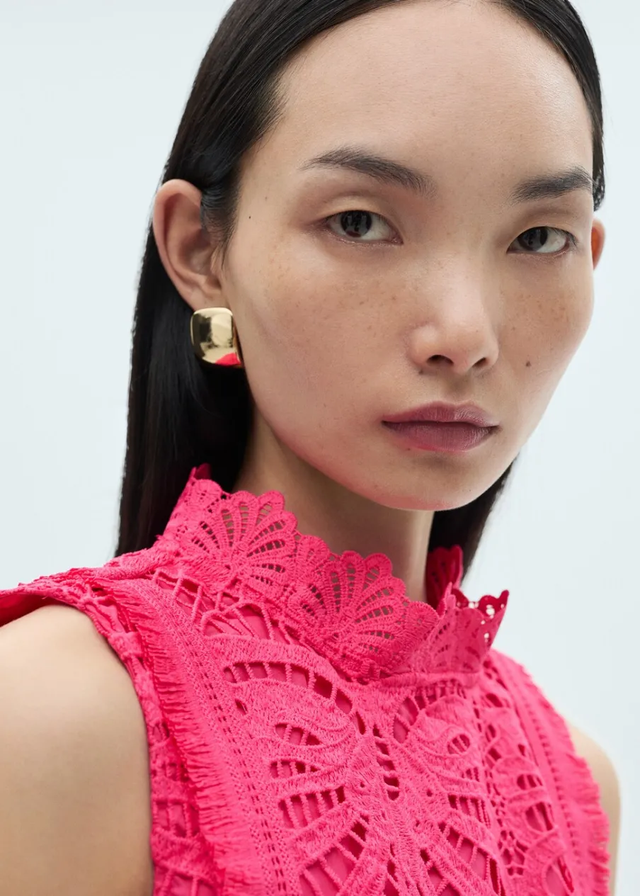 Tkanina z cienkiej dzianiny. Model prosty. Szydełkowy model. Półgolf. Bez rękawów. Zapięcie na guzik z tyłu. Wewnętrzna podszewka. Total look.