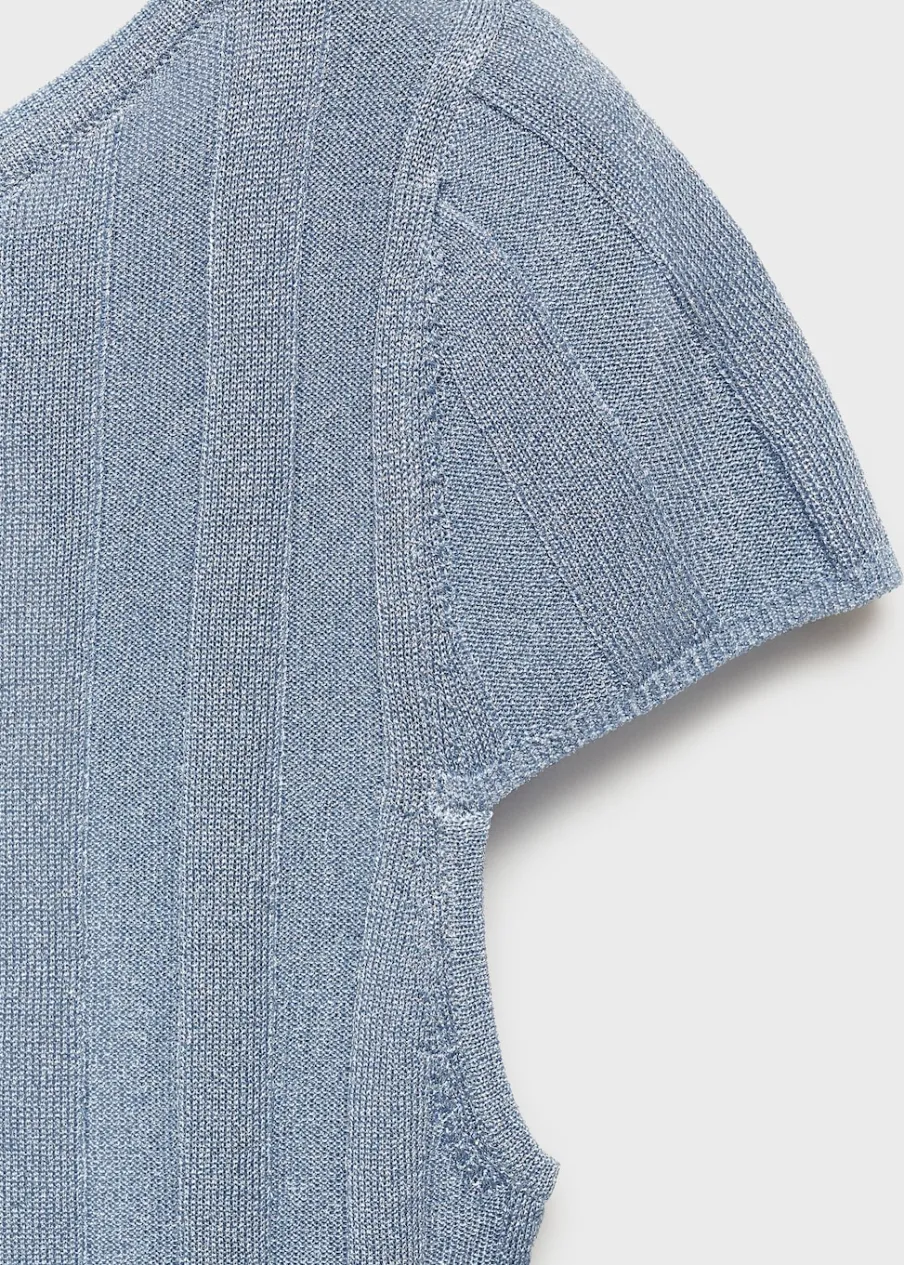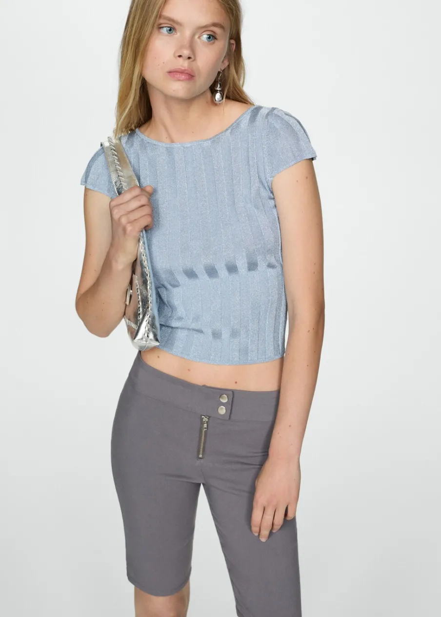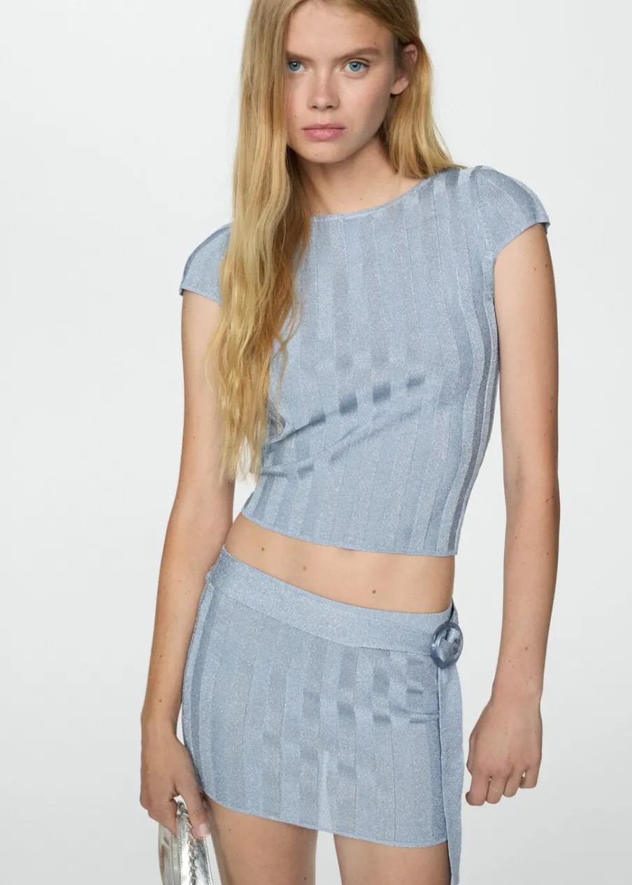 Tkanina z cienkiej dzianiny. Tkanina lureks. Model prosty. Plecy z wycięciem. Okrągły dekolt. Krótki rękaw. Wiązanie z tyłu. Total look. Model wcięty.