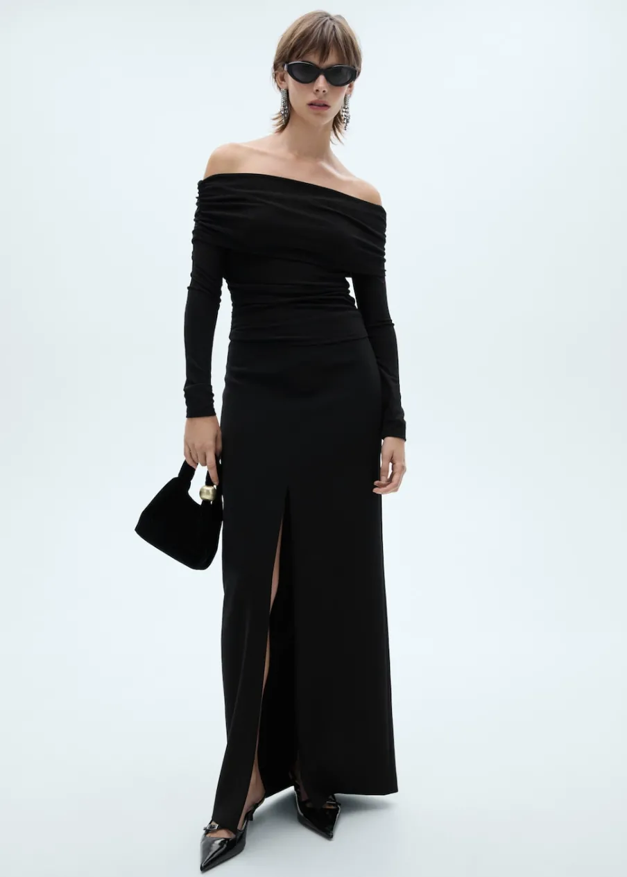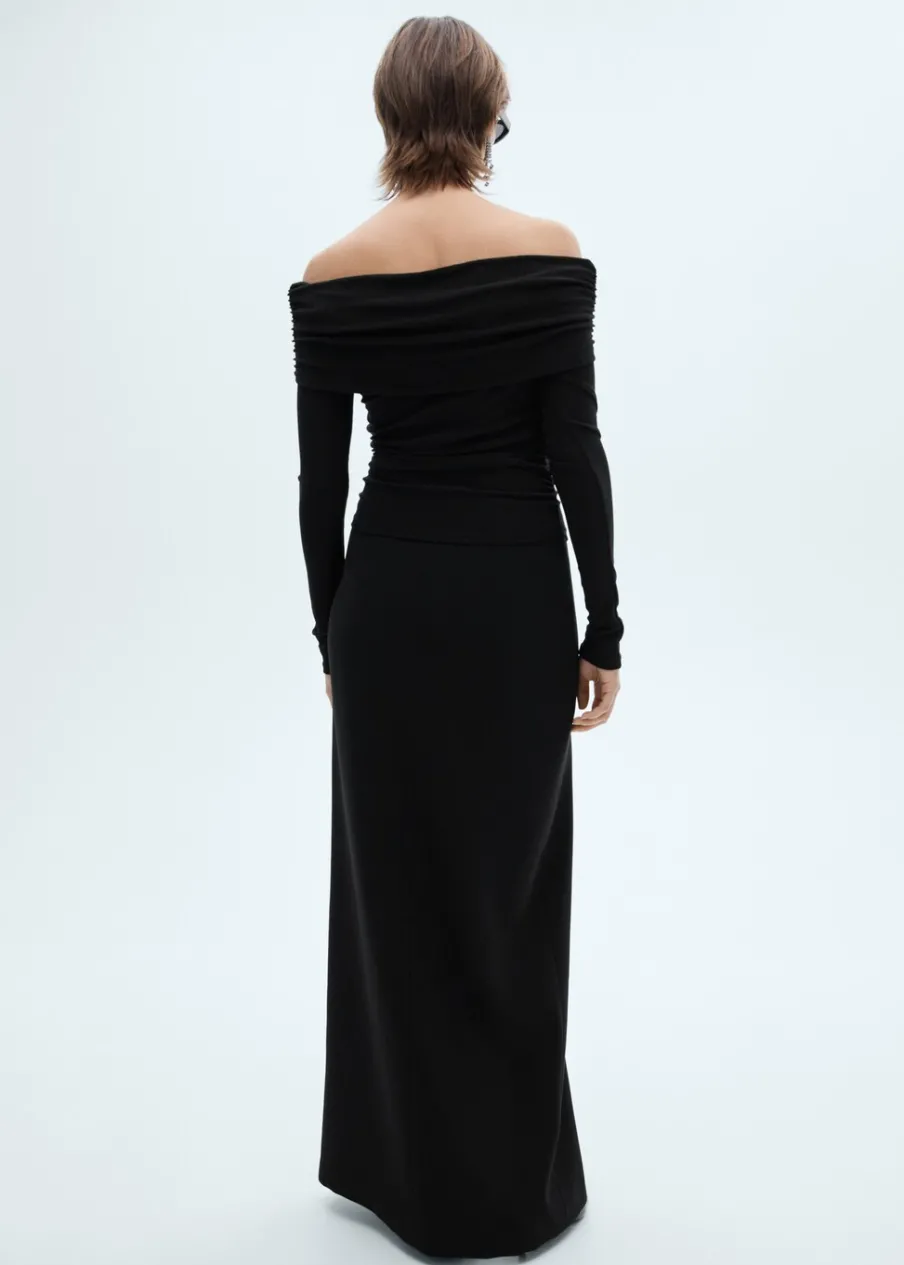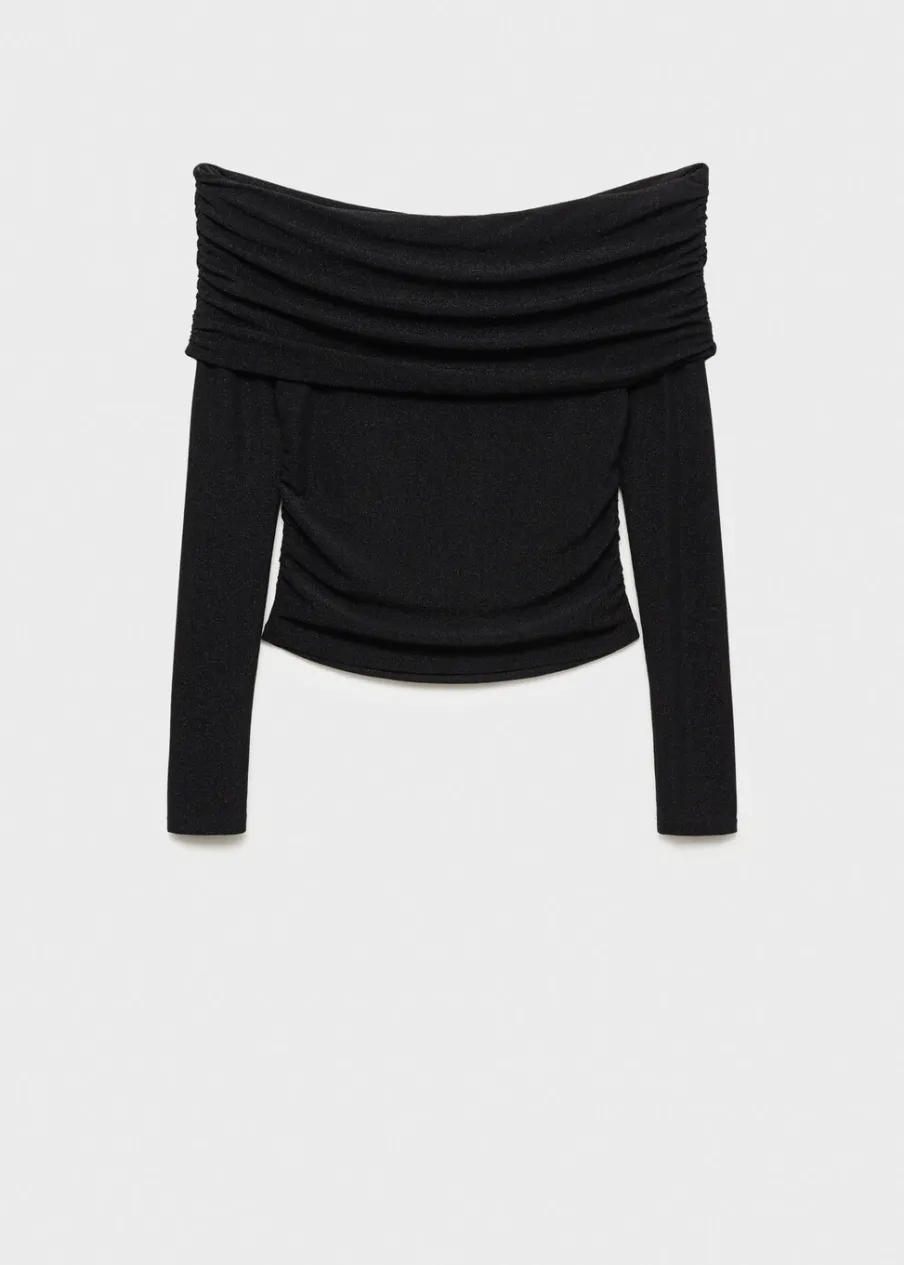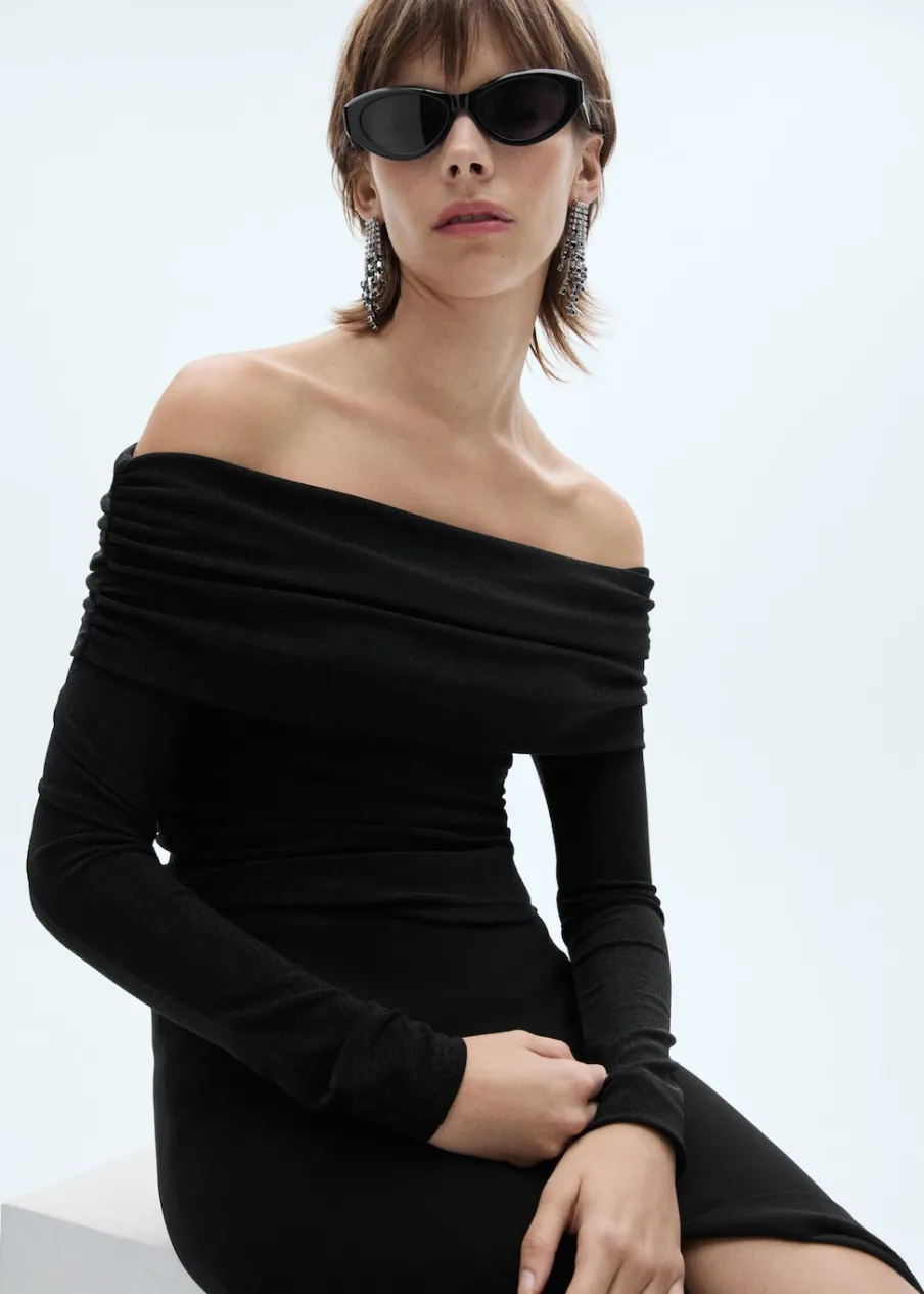 Bez zapięcia. Fason z odkrytymi ramionami. Odkryte ramiona. Długi rękaw. Drapowane detale. Modelka ma 175 cm wzrostu i nosi rozmiar S/36. Modelka ma 178 cm wzrostu i nosi rozmiar S/36. Kolekcja wizytowa. Tkanina lureks. Model wcięty.