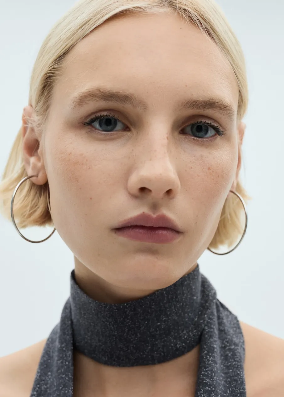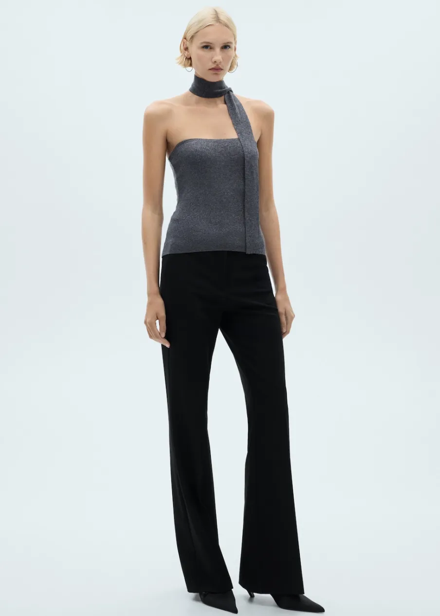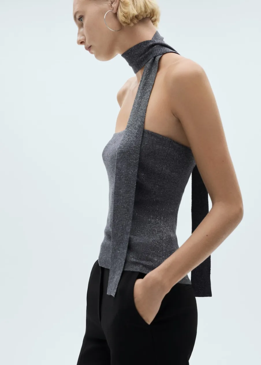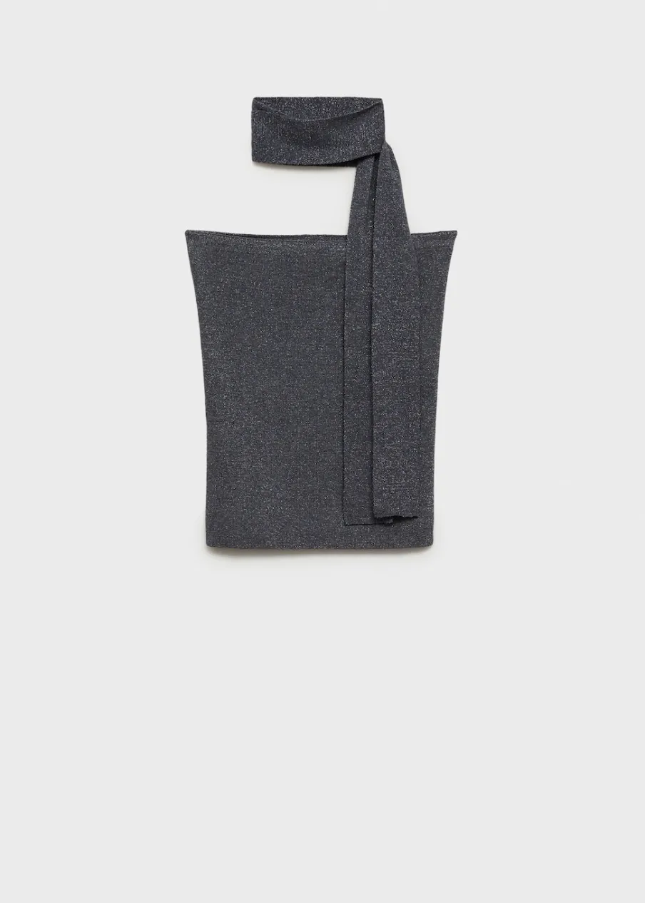 Tkanina z cienkiej dzianiny. Tkanina lureks. Model wcięty. Dekolt bez ramiączek. Bez rękawów. Szarfa pod szyją. W stylu choker. Bez zapięcia. Kolekcja wizytowa.