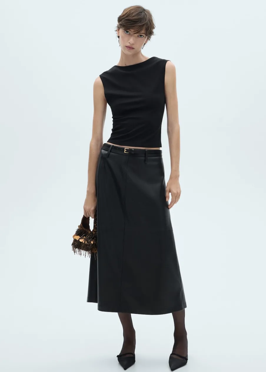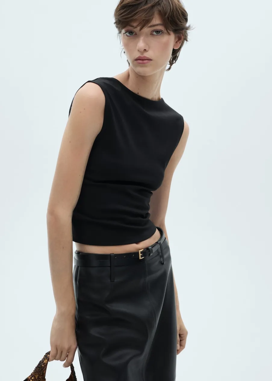Model wcięty. Deseń crop. Okrągły dekolt. Szerokie ramiączka. Bez rękawów. Plecy z wycięciem. Bez zapięcia. Kolekcja wizytowa.
