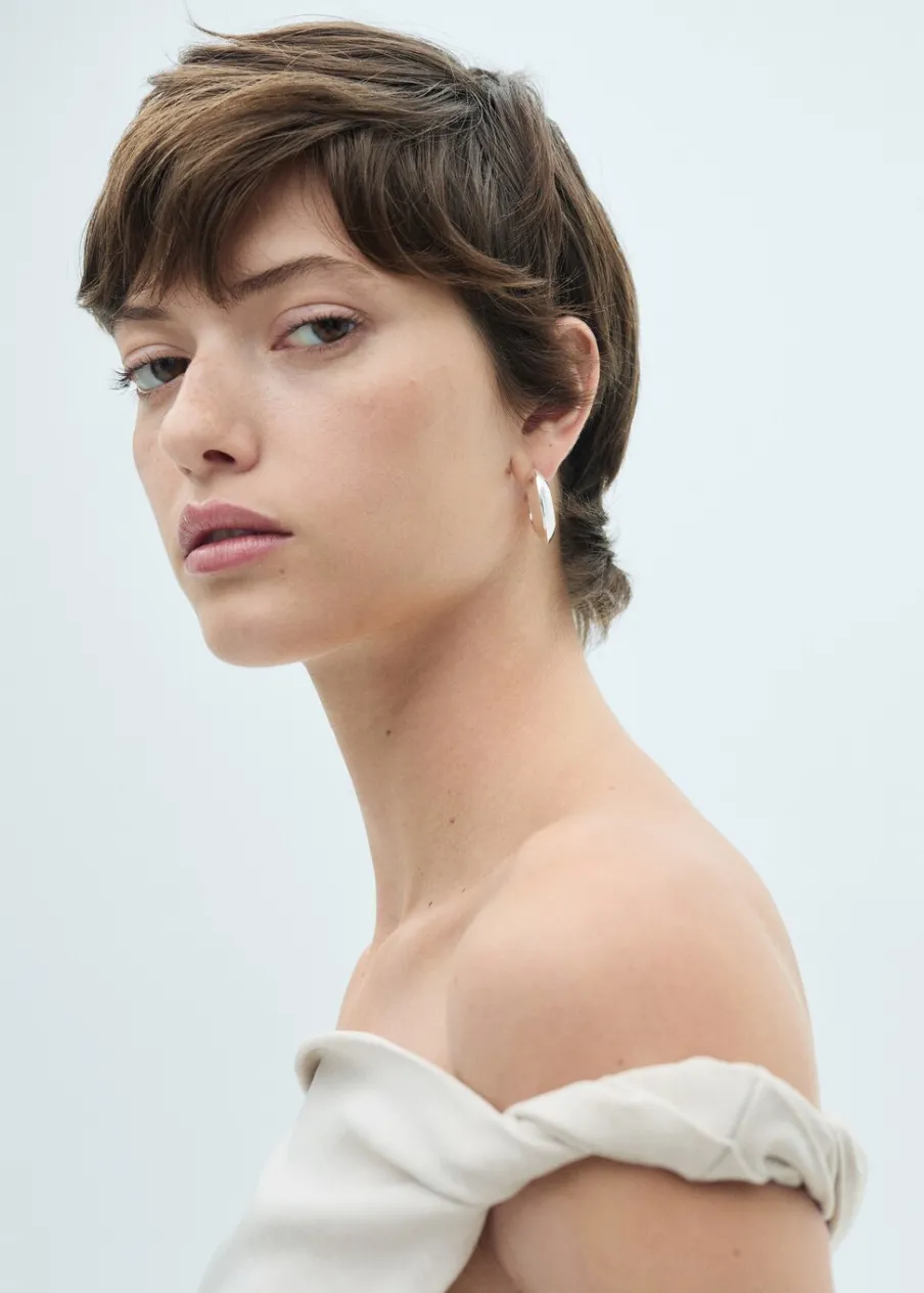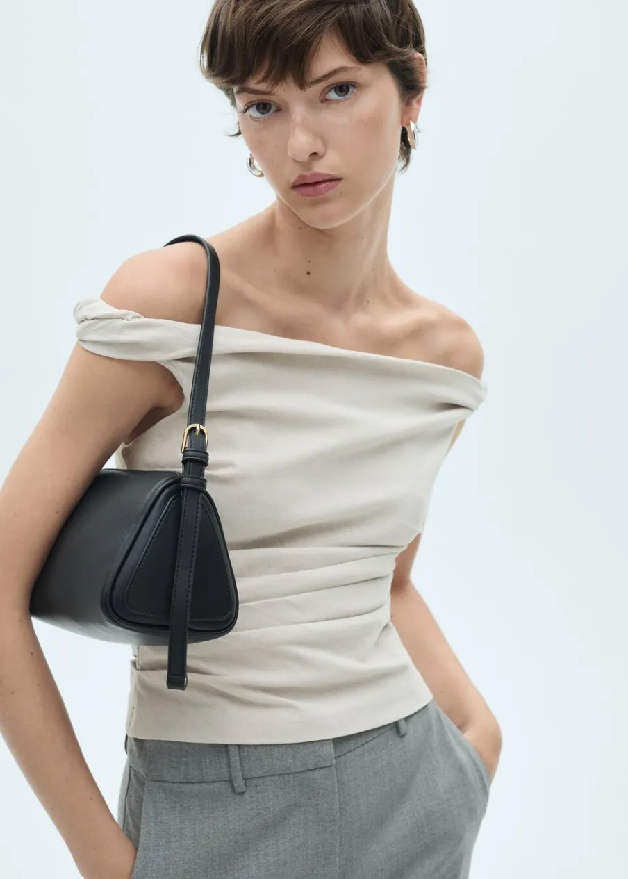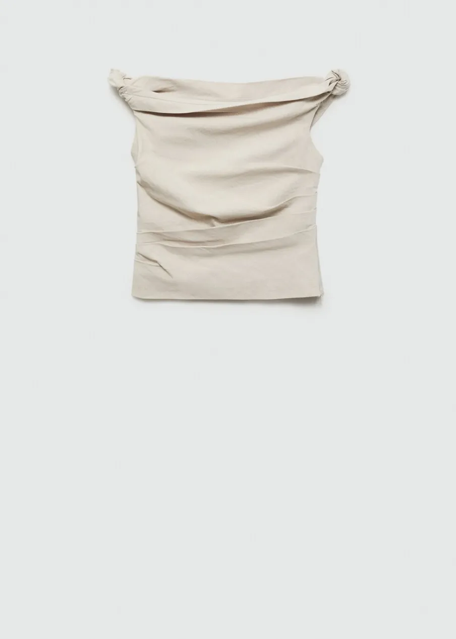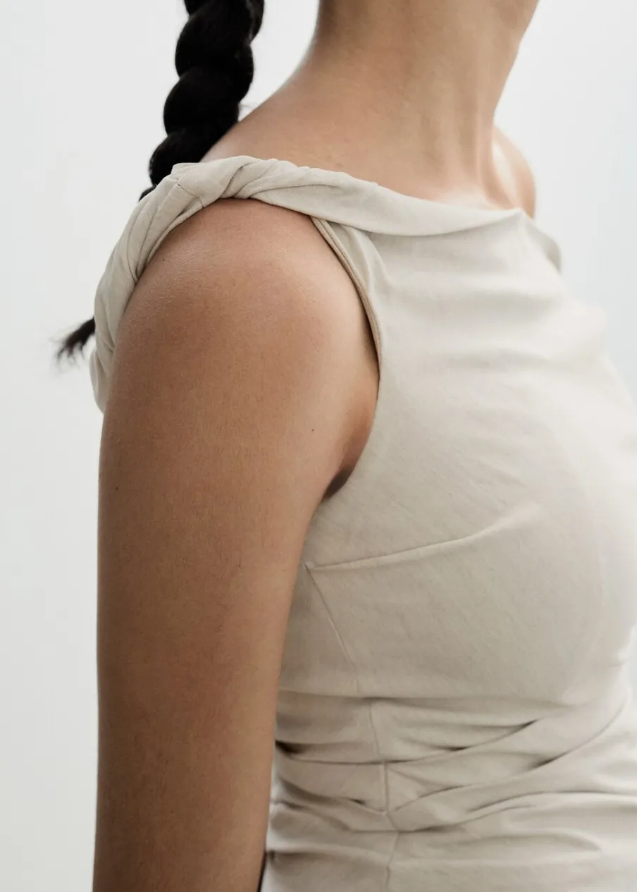 Model z drapowaniem. Bez rękawów. Szerokie ramiączka. Kryte zapięcie na zamek z boku. Modelka ma 174 cm wzrostu i nosi rozmiar S/36. Model wcięty. Fason z odkrytymi ramionami. Odkryte ramiona.