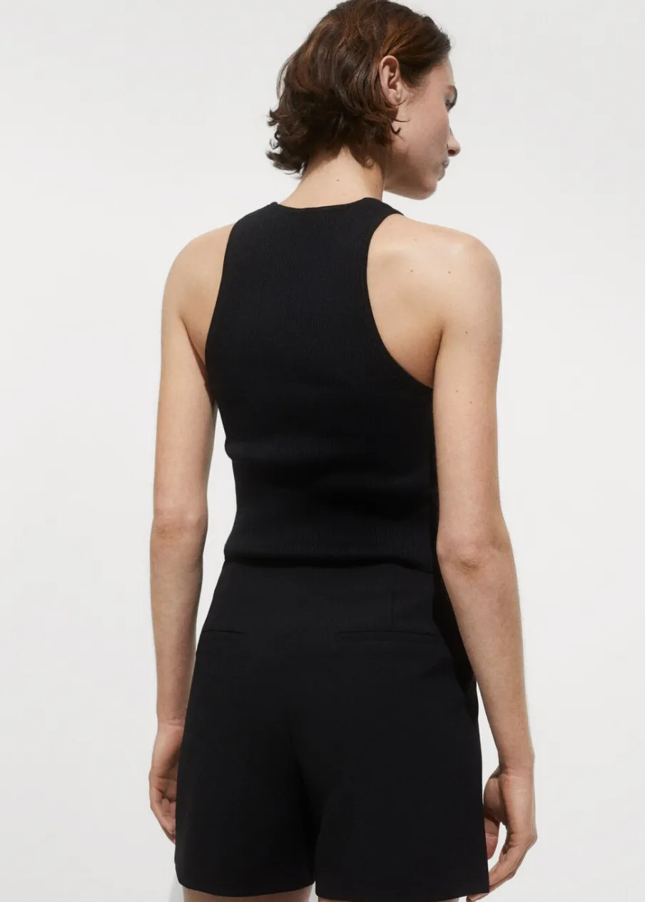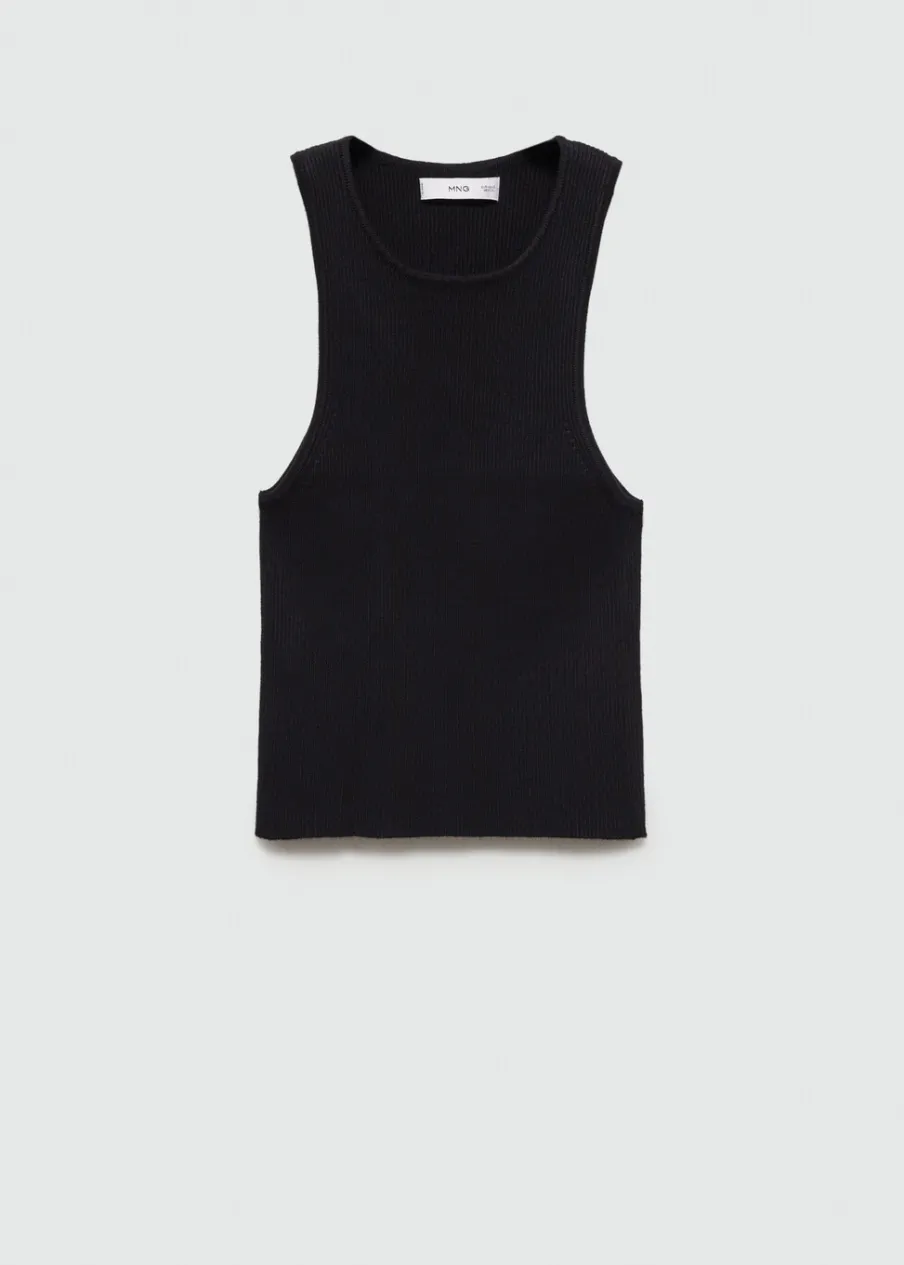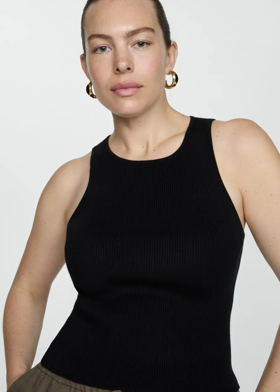 Ściągaczowa tkanina. Tkanina z cienkiej dzianiny. Deseń crop. Okrągły dekolt. Bez rękawów. Szerokie ramiączka. Dostępne w Plus Size. Model wcięty.