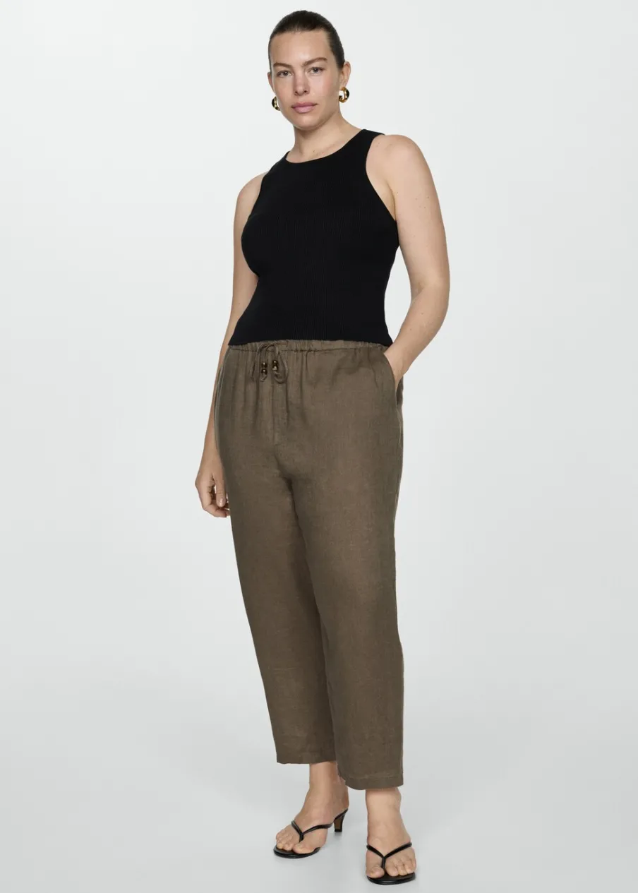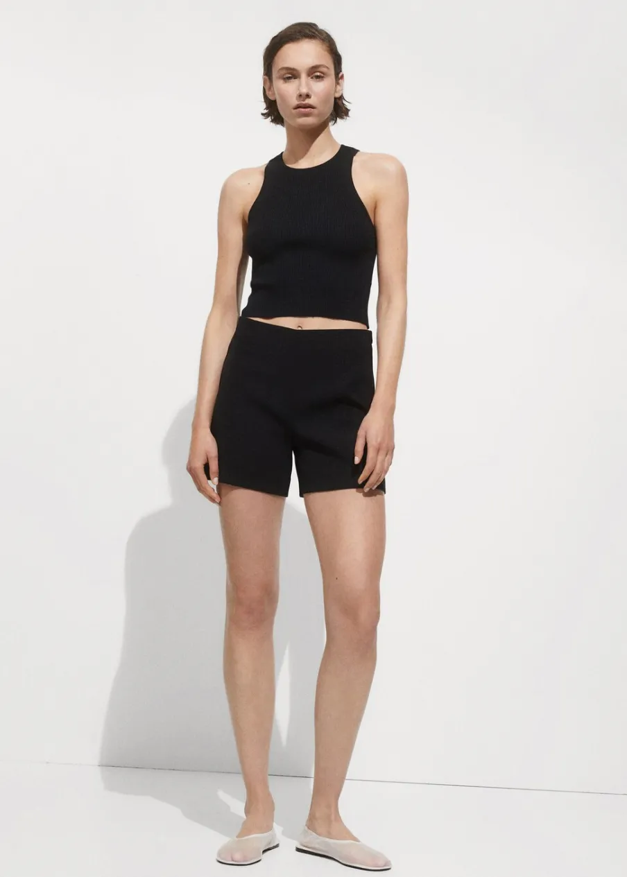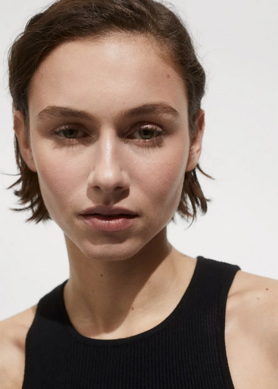 Ściągaczowa tkanina. Tkanina z cienkiej dzianiny. Deseń crop. Okrągły dekolt. Bez rękawów. Szerokie ramiączka. Dostępne w Plus Size. Model wcięty.