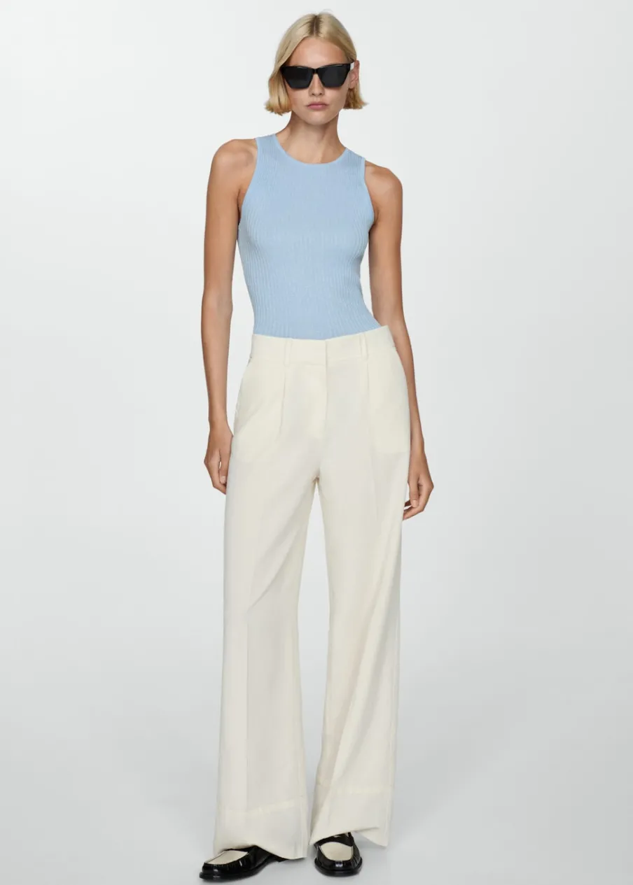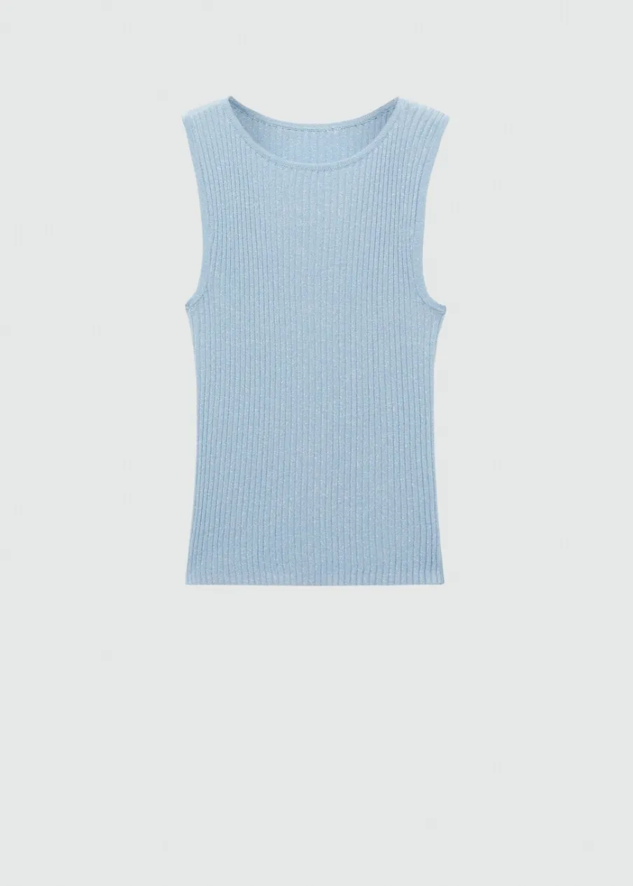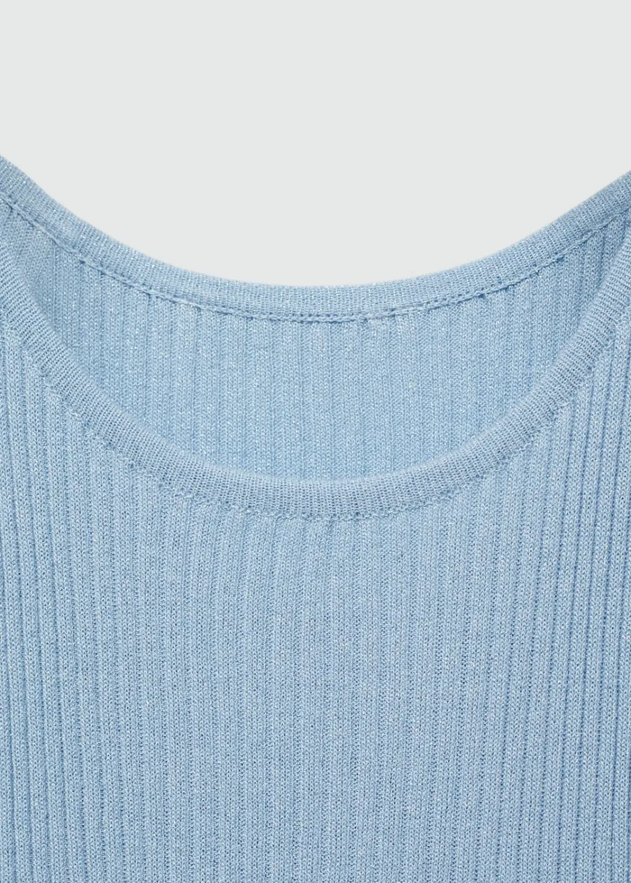 OpisTkanina z cienkiej dzianiny. Tkanina ze ściągaczowej dzianiny. Okrągły dekolt. Bez rękawów. Model wcięty.