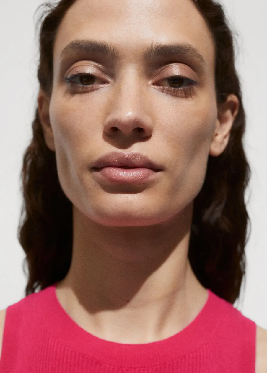 OpisTkanina z cienkiej dzianiny. Tkanina ze ściągaczowej dzianiny. Okrągły dekolt. Szerokie ramiączka. Bez zapięci…