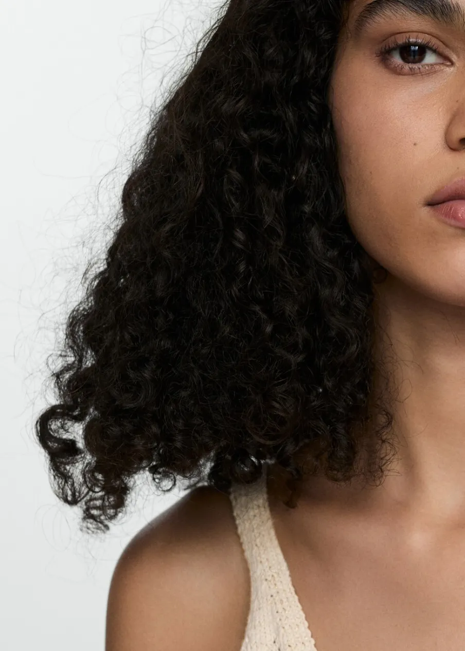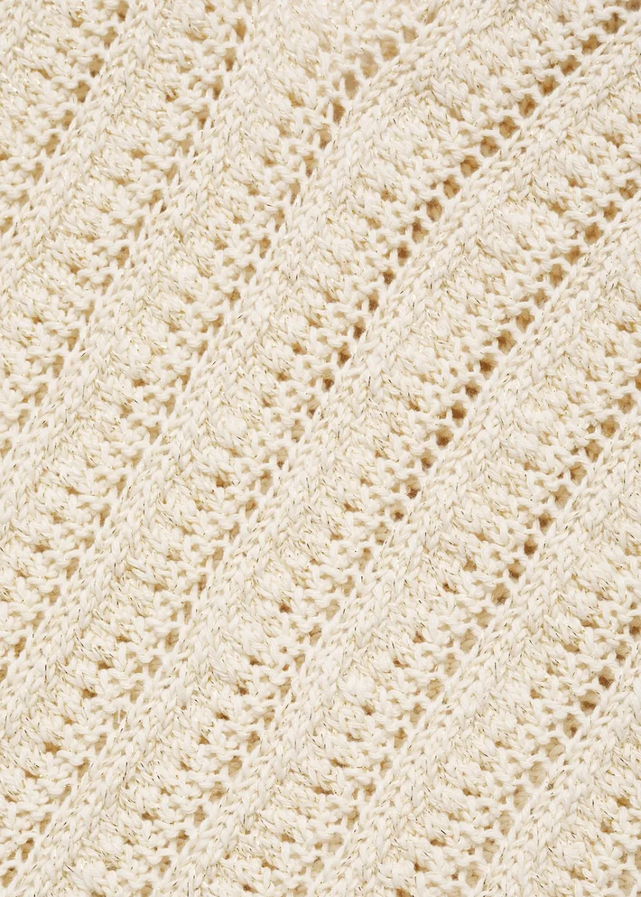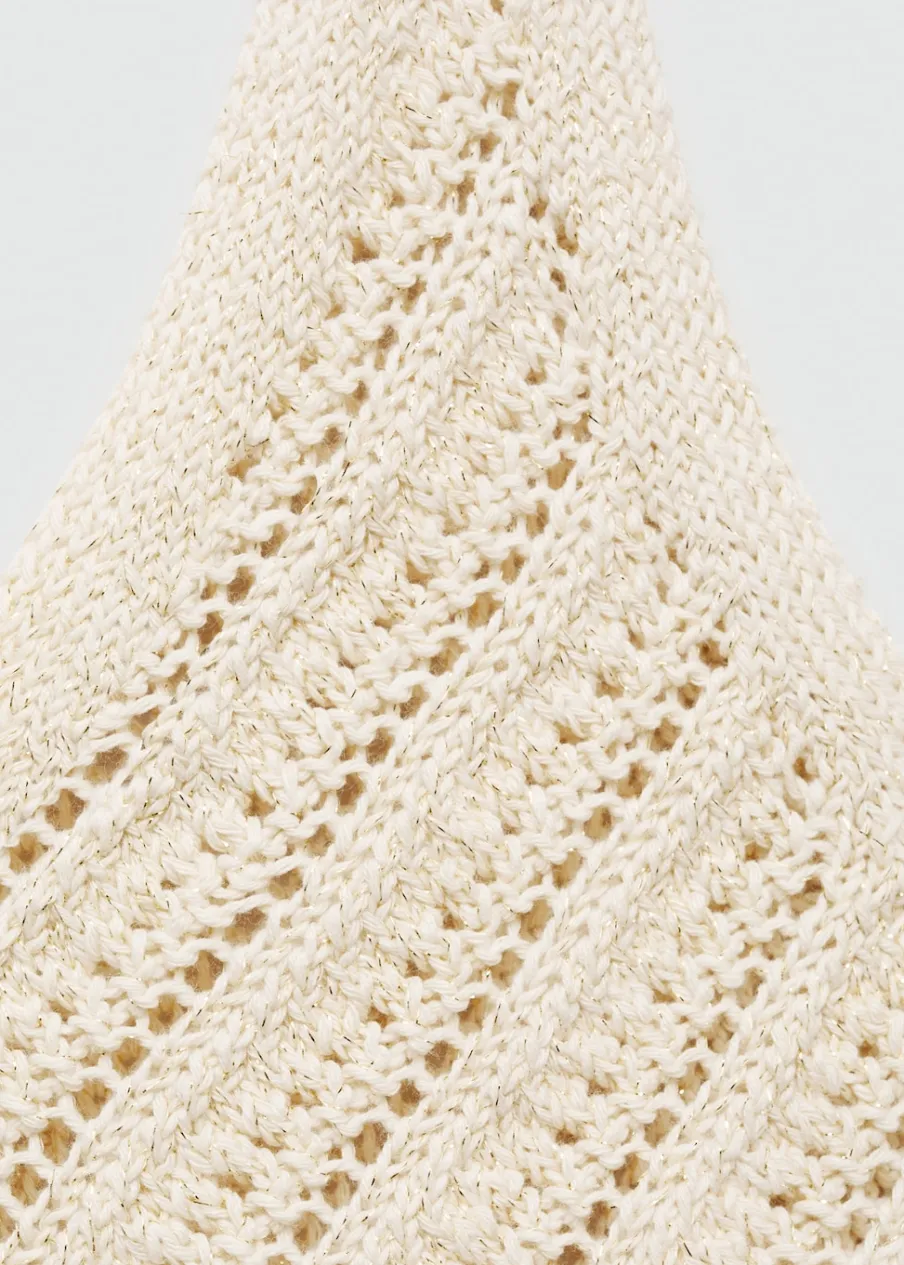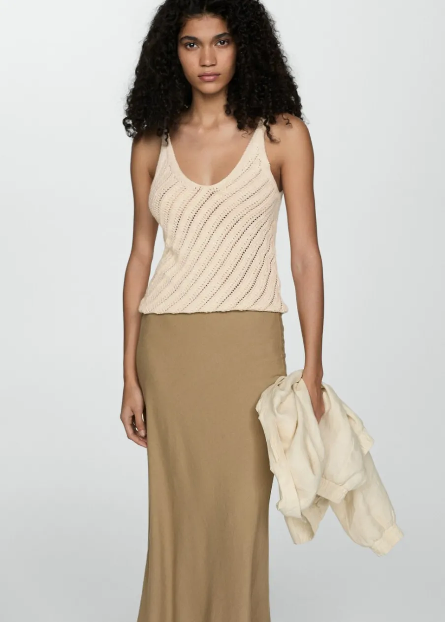 Tkanina z grubej dzianiny. Tkanina mieszanka bawełny. Model prosty. Dekolt V. Cienkie ramiączka. Bez rękawów. Szydełkowa tkanina.