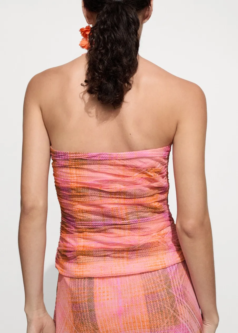 OpisDeseń crop. Wzór w kratę. W stylu gorsetu. Dekolt bez ramiączek. Kryte zapięcie na zamek z boku. Drapowane deta…