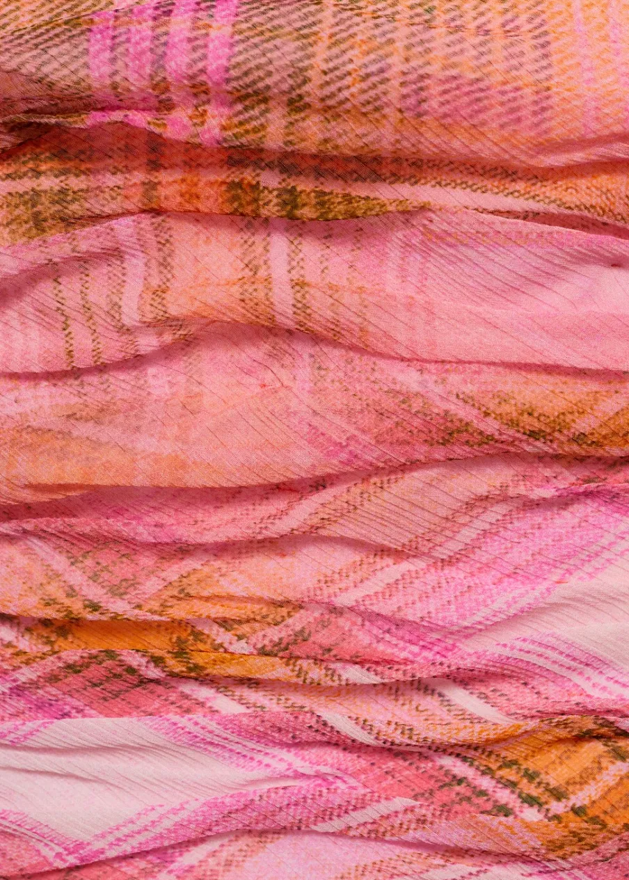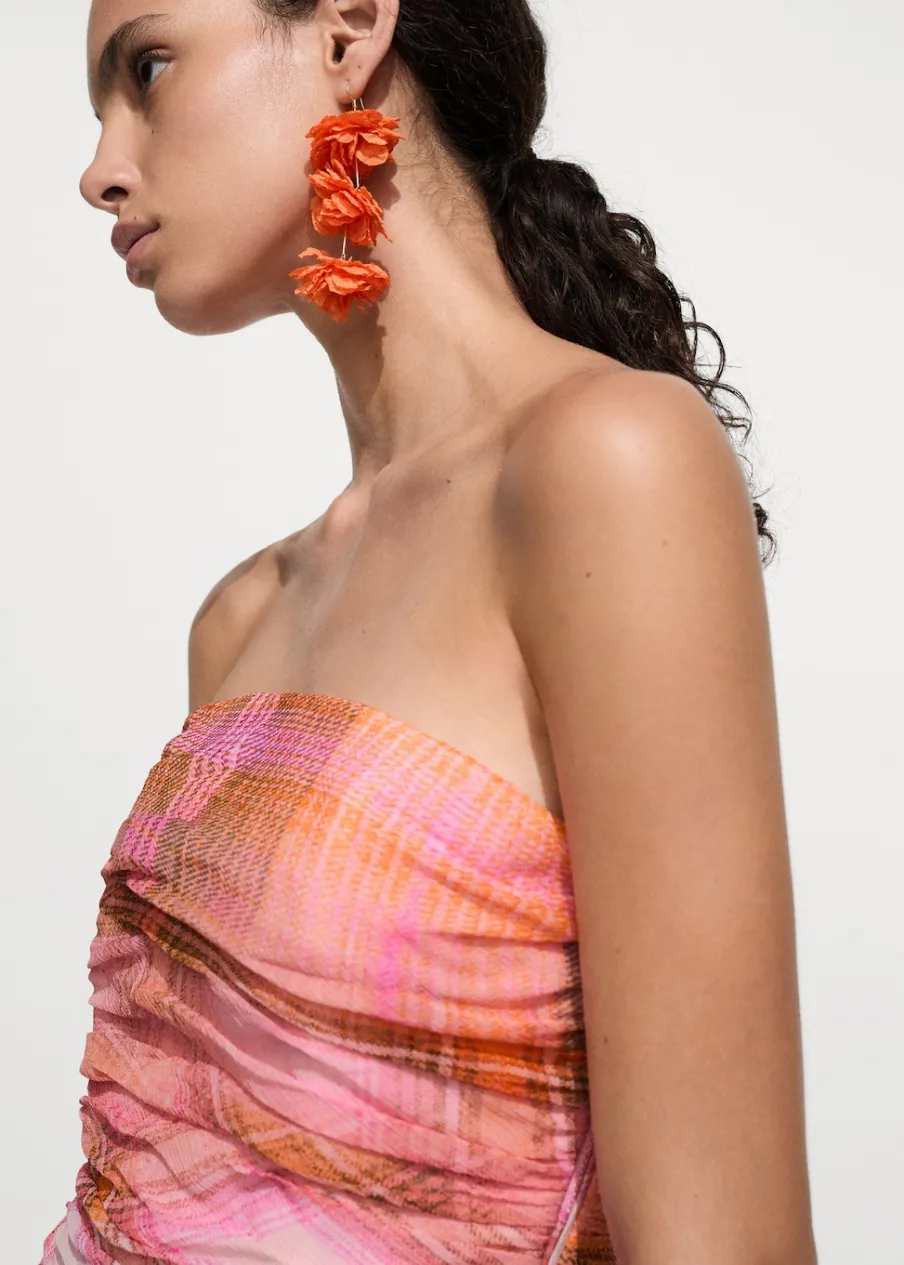 Deseń crop. Wzór w kratę. W stylu gorsetu. Dekolt bez ramiączek. Kryte zapięcie na zamek z boku. Drapowane detale. Wewnętrzna podszewka. Total look. Model wcięty.