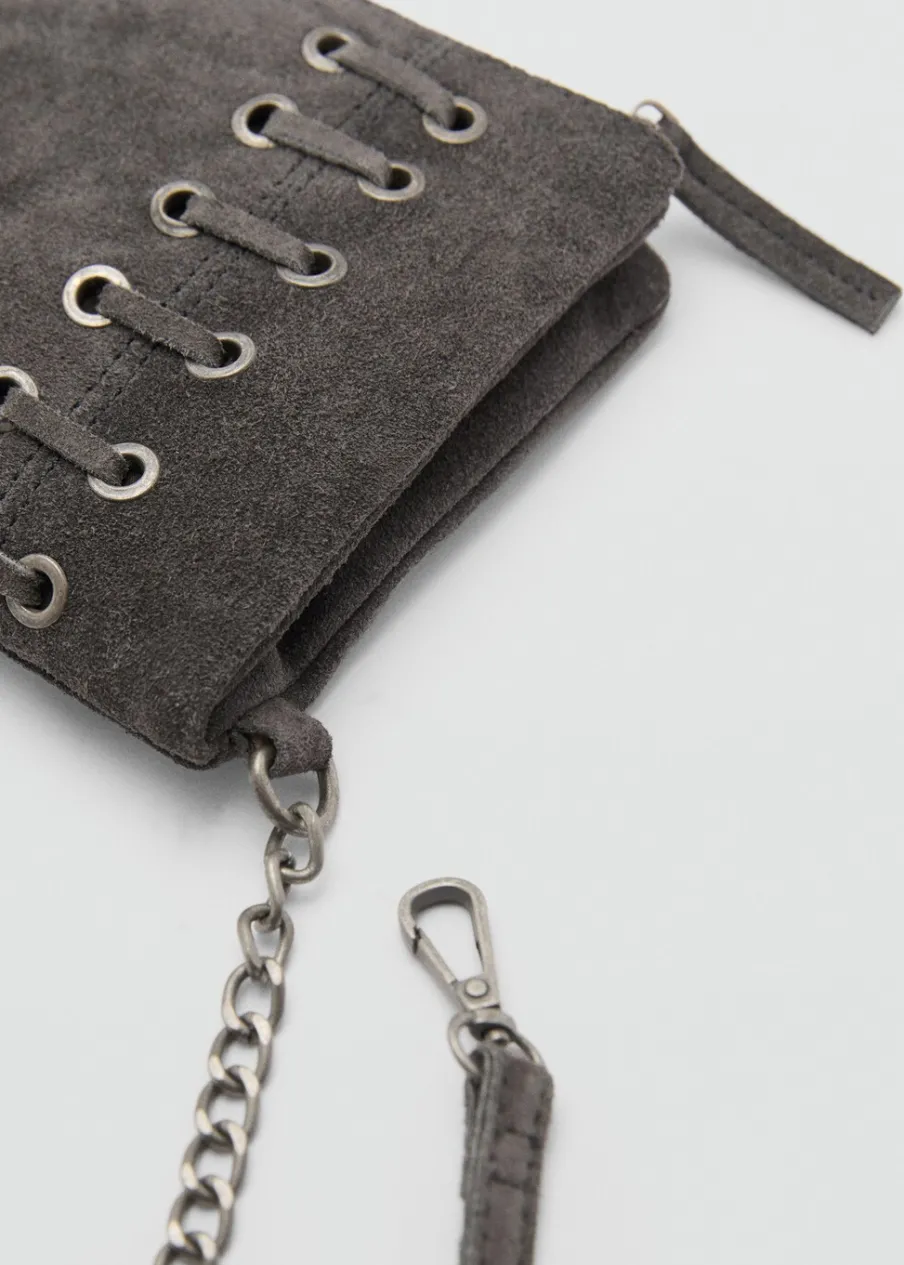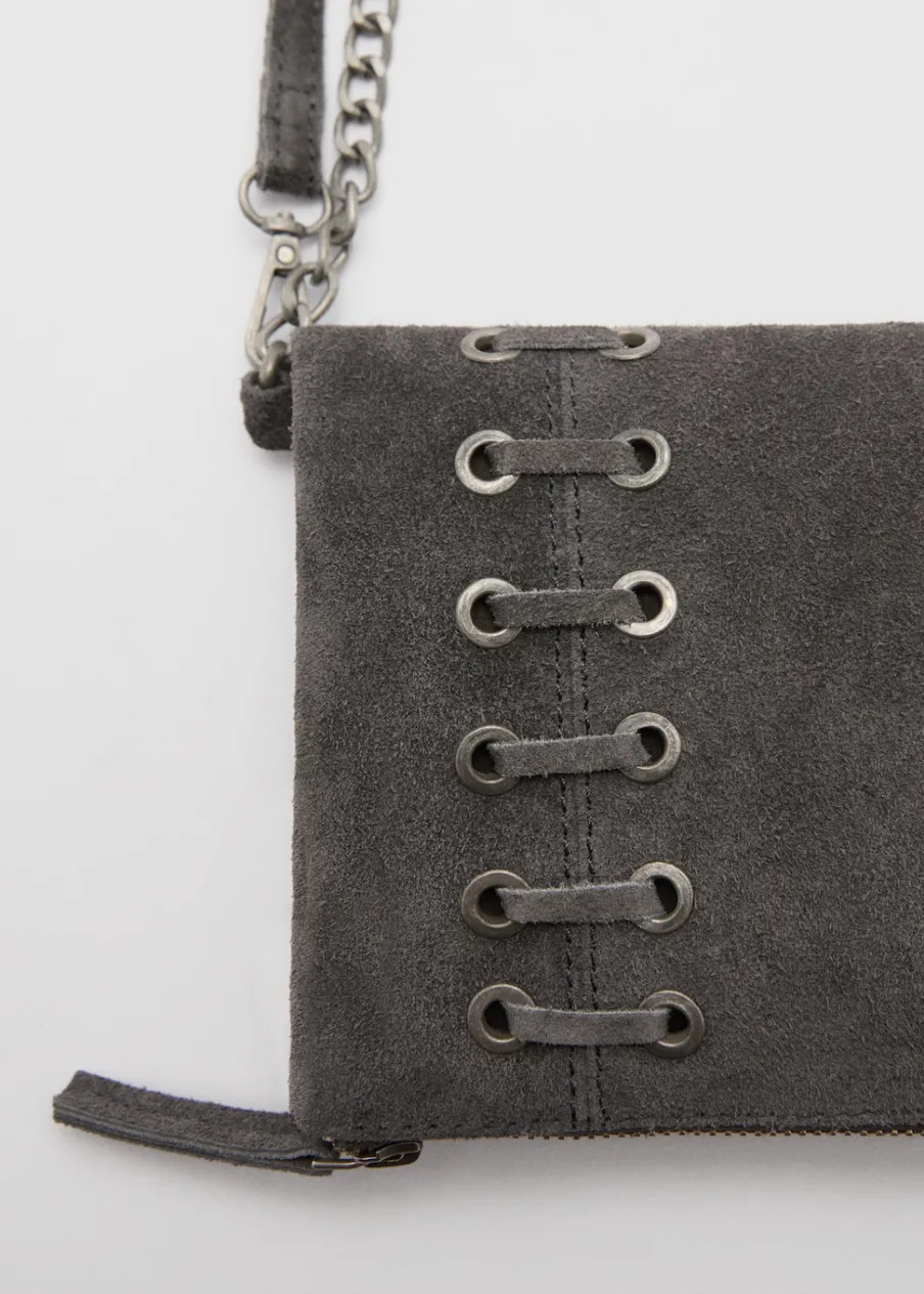 100% skóra zamszowa. Łańcuchowy uchwyt. Zapięcie na suwak. Metalowe zapięcie na magnes. Model ze sznurka.