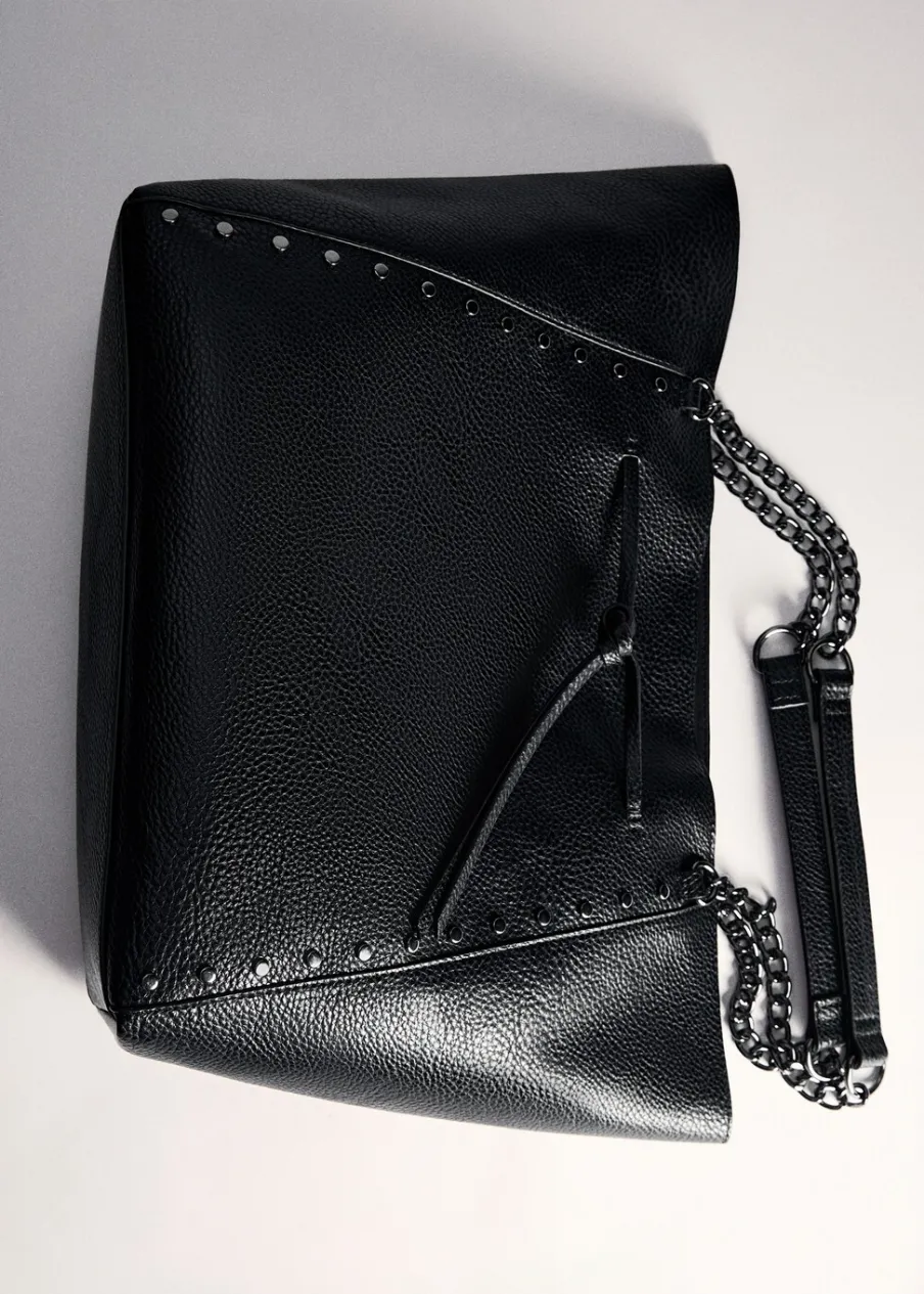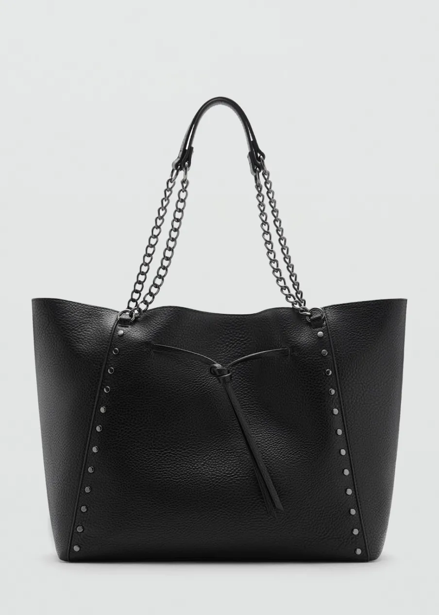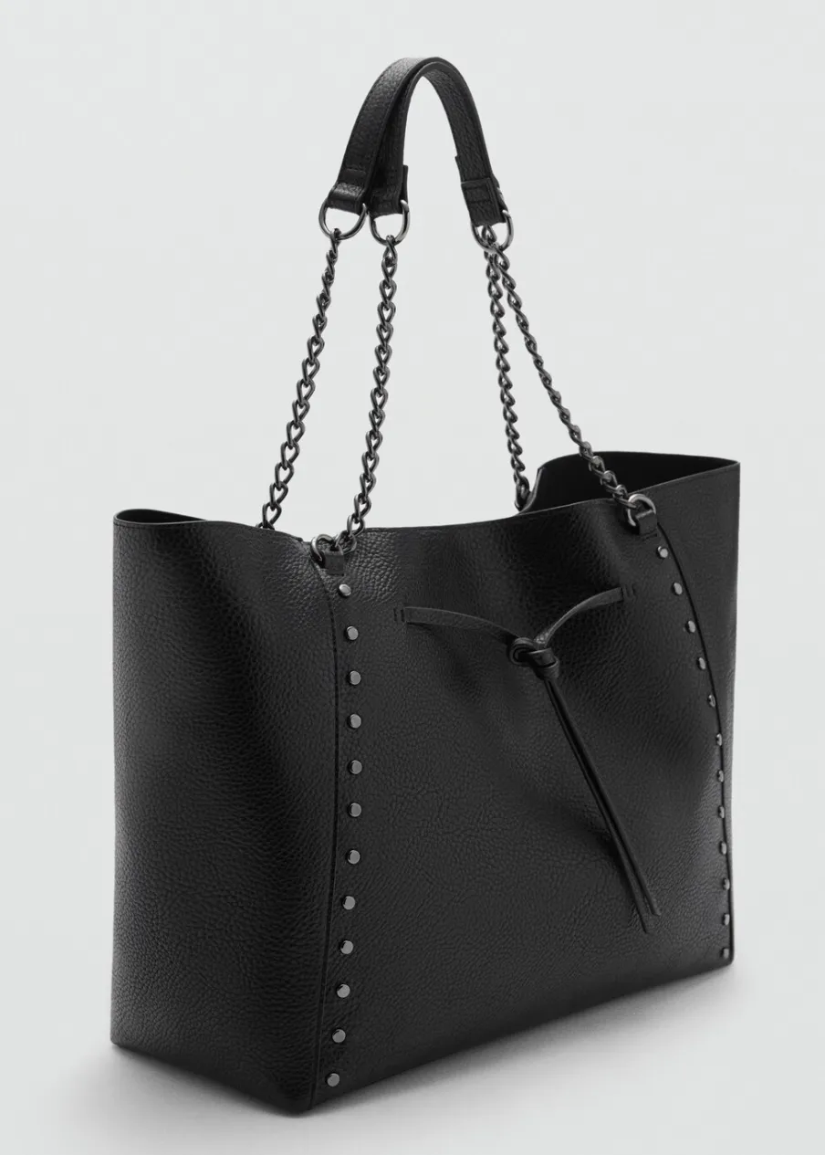 W stylu shopper. Duża wielkość. Ramiączka z łańcuszków. Detal z ćwiekami. Zapięcie ze sznurkiem do regulacji. Powrót do szkoły.