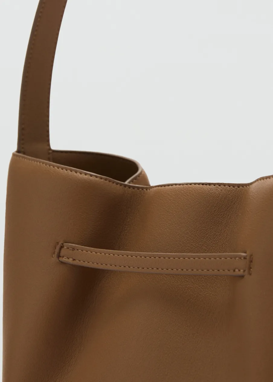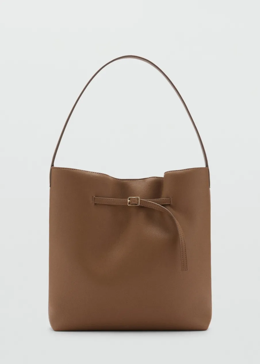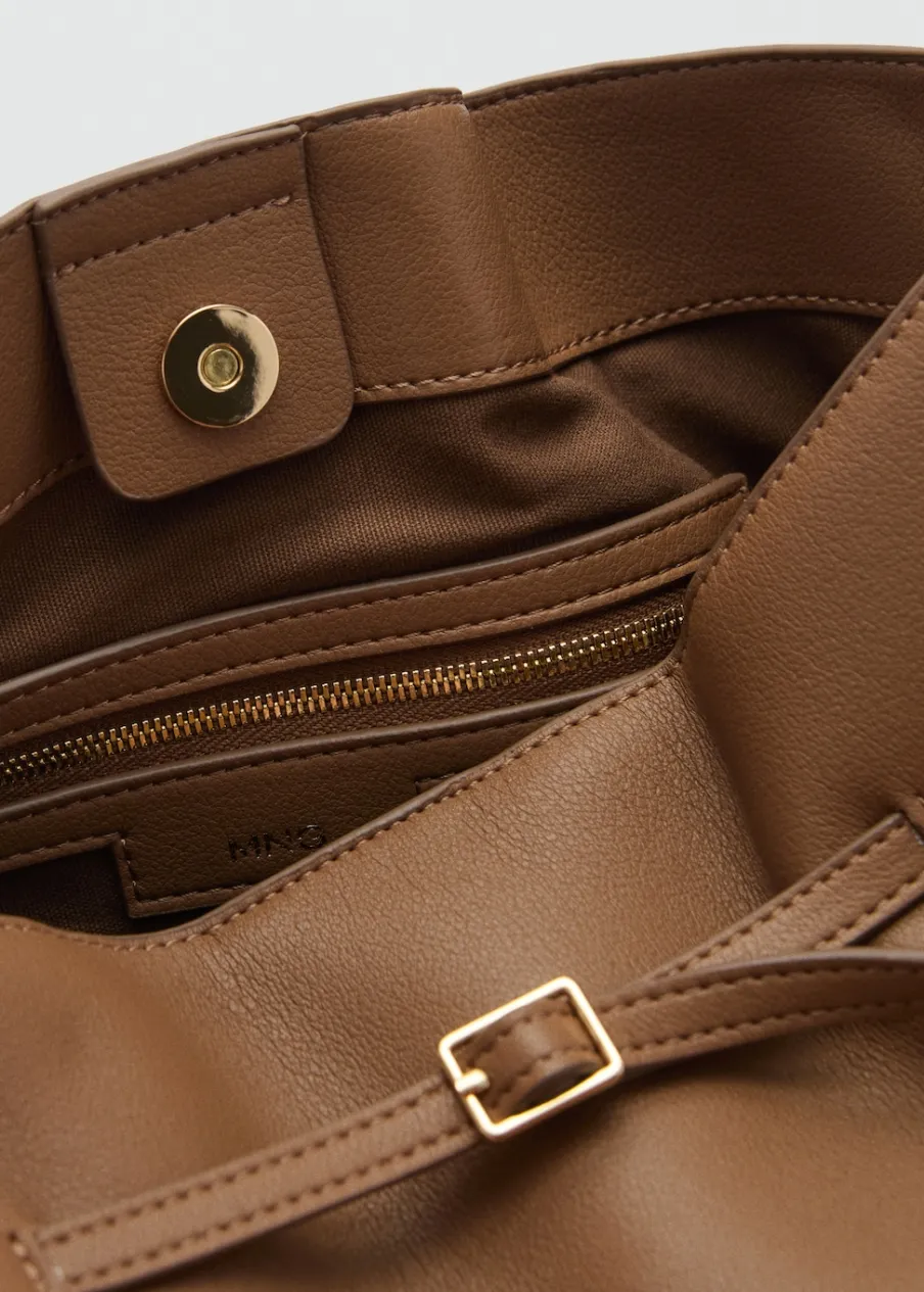 Efekt skóry. Średnia wielkość. Fason bucket hat. Pasek na ramię. Metalowe zapięcie na magnes. Ozdobna klamra.