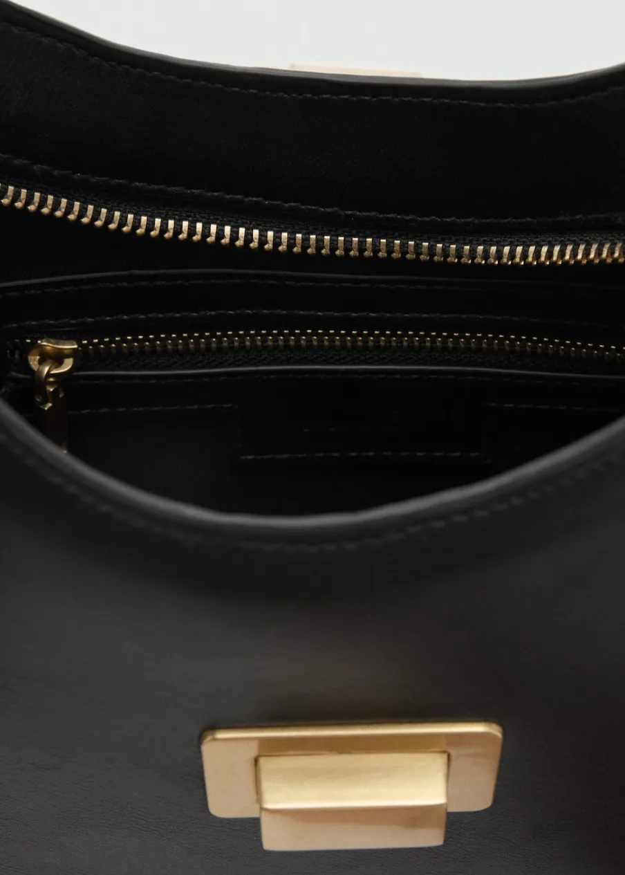 Wewnętrzna podszewka. Pasek na ramię. Metalowe zapięcie na zatrzask. Wewnętrzna kieszeń zapinana na suwak.