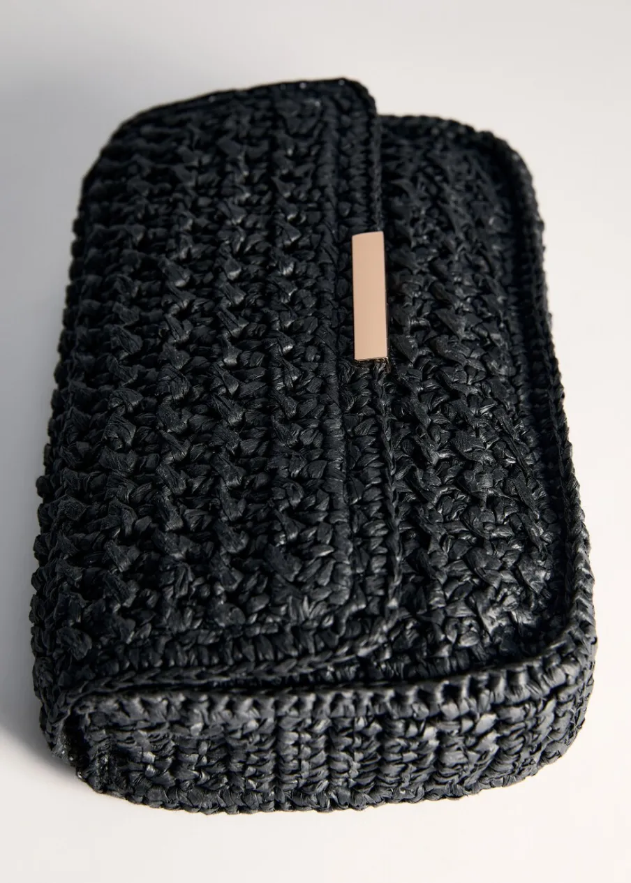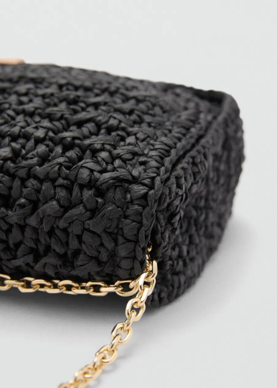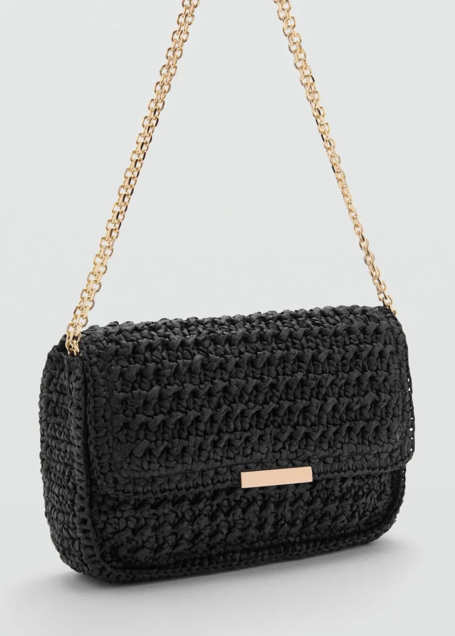 Średnia wielkość. Tkanina z naturalnego włókna. Pasek do noszenia na ramieniu. Długi pasek z łańcucha. Zamknięcie na klapę. Metalowe zapięcie na magnes.