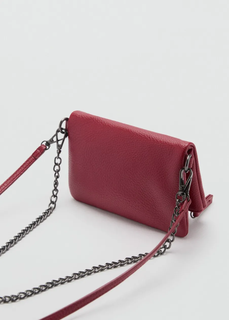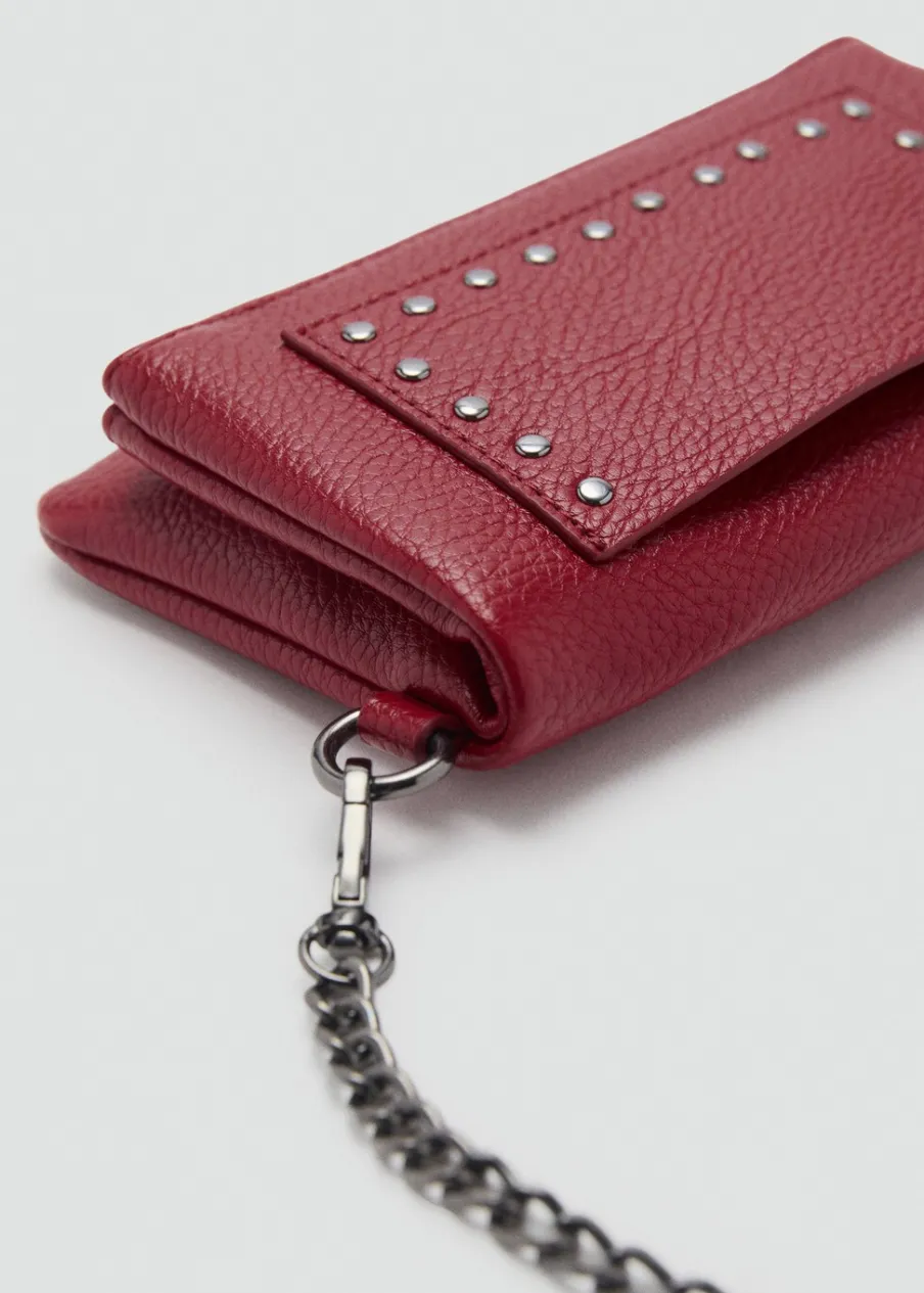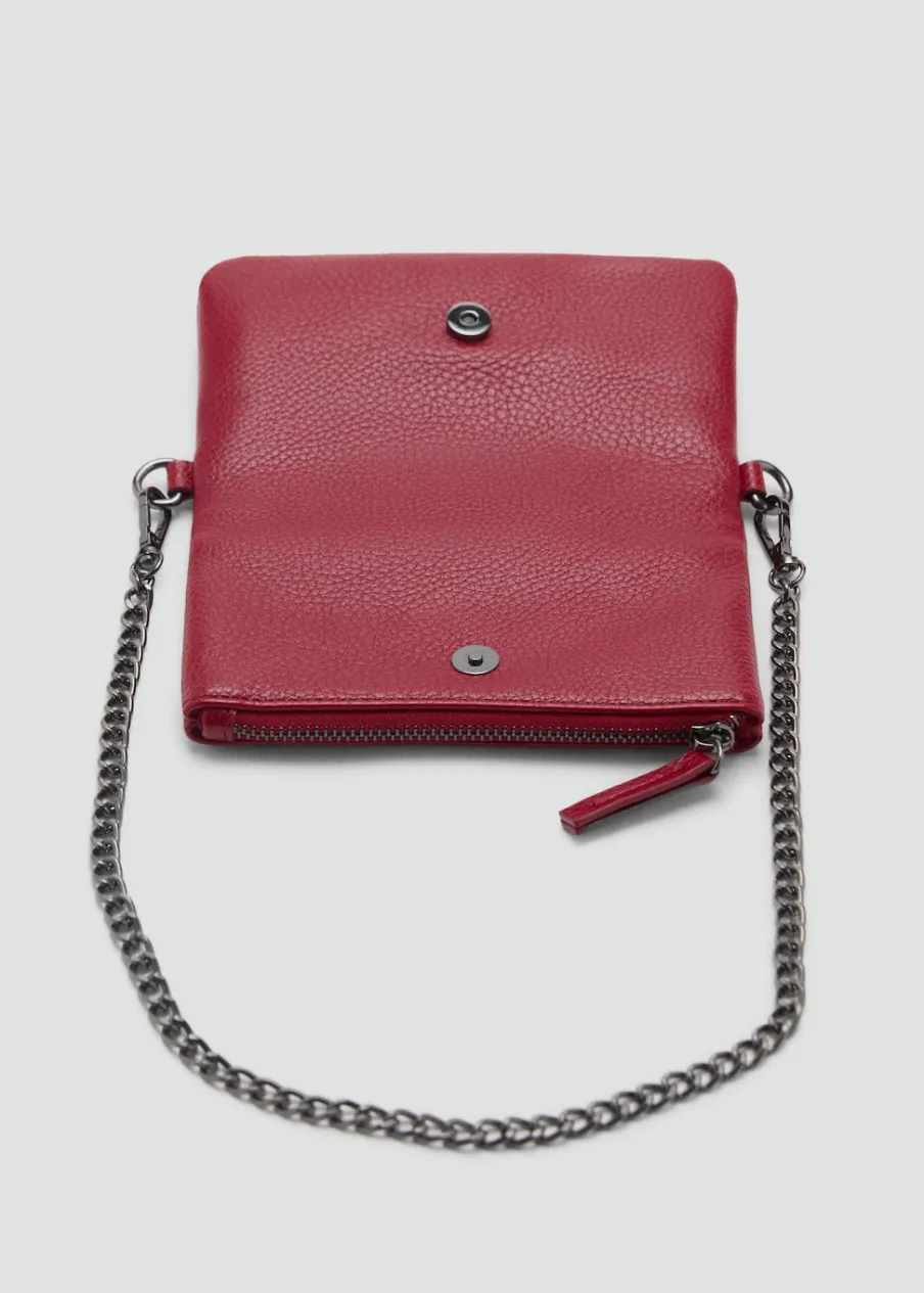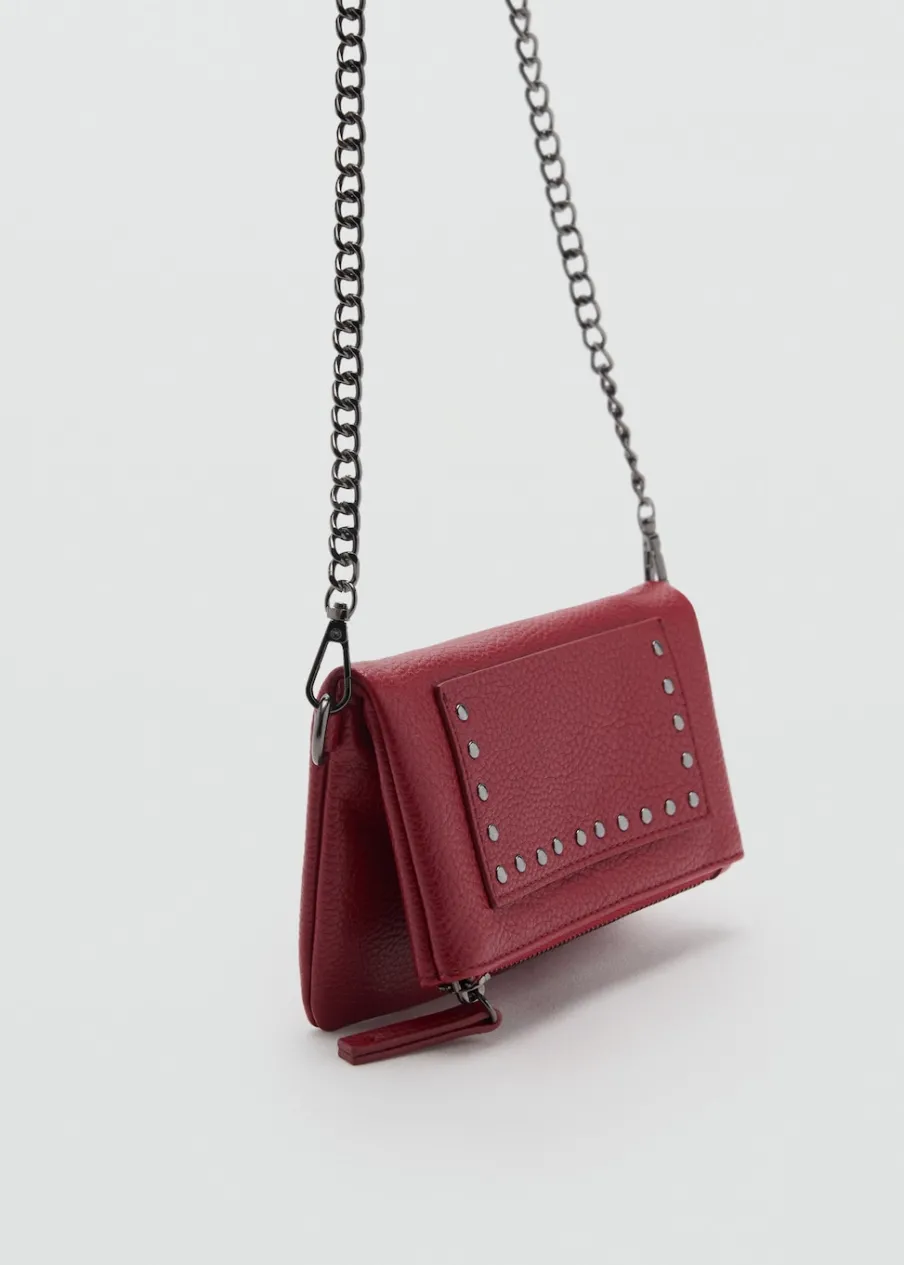 Efekt skóry. Krótki łańcuchowy uchwyt. Długi uchwyt. Ozdoba z ćwieków. Zapięcie na suwak. Podwójny uchwyt. Zewnętrzna kieszeń. Zapięcie na zatrzaskowy guzik.
