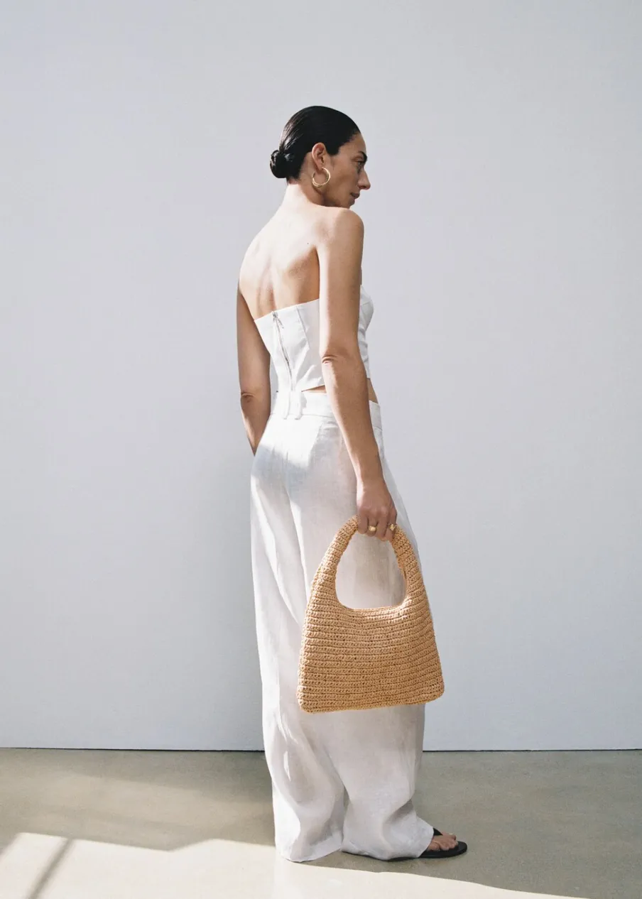 Tkanina z naturalnego włókna. Średnia wielkość. Krótki uchwyt. Pasek na ramię. Zapięcie na suwak. Wewnętrzna podszewka.
