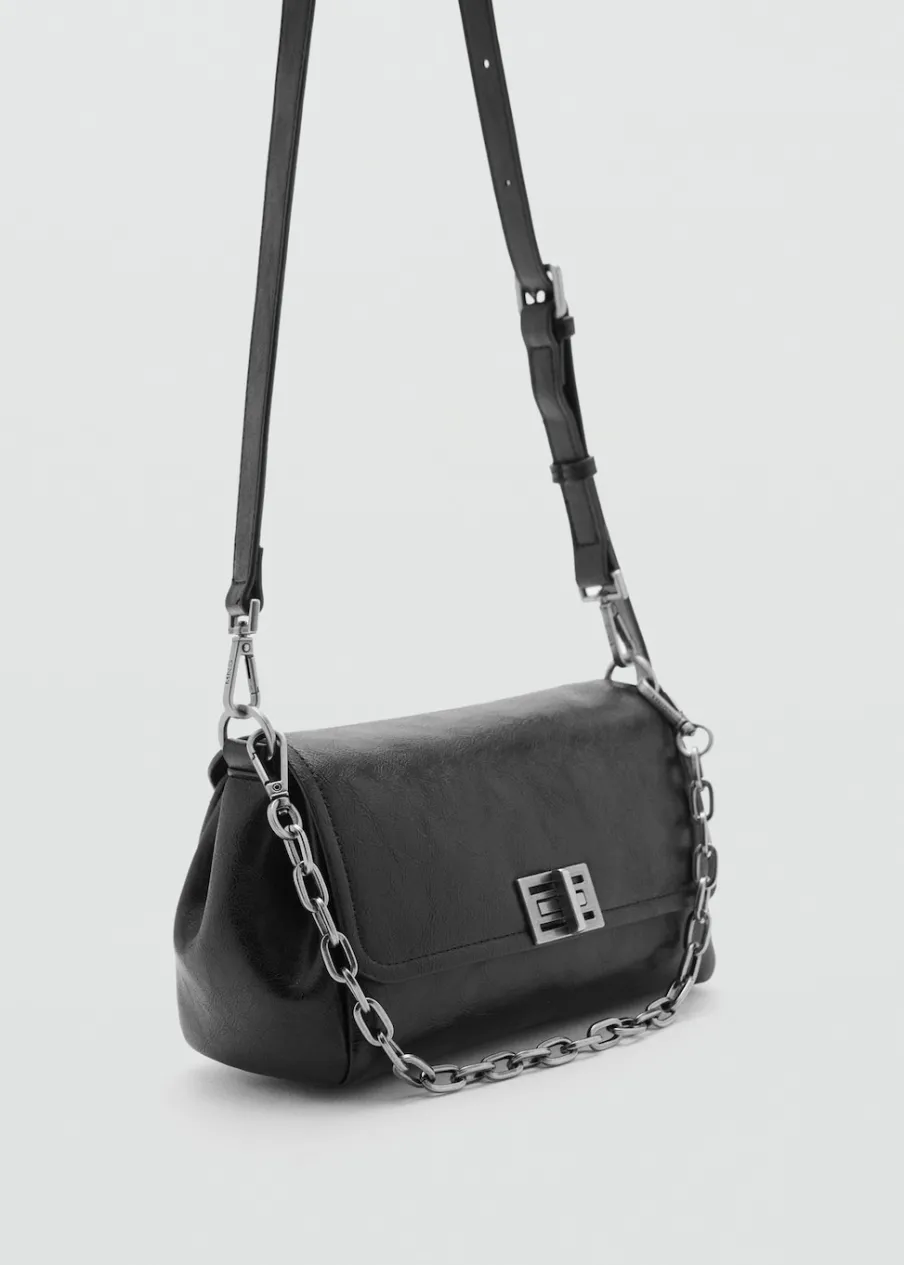 Efekt skóry. Mała wielkość. Długi, regulowany uchwyt. Zamknięcie na klapę. Metalowe obrotowe zapięcie.