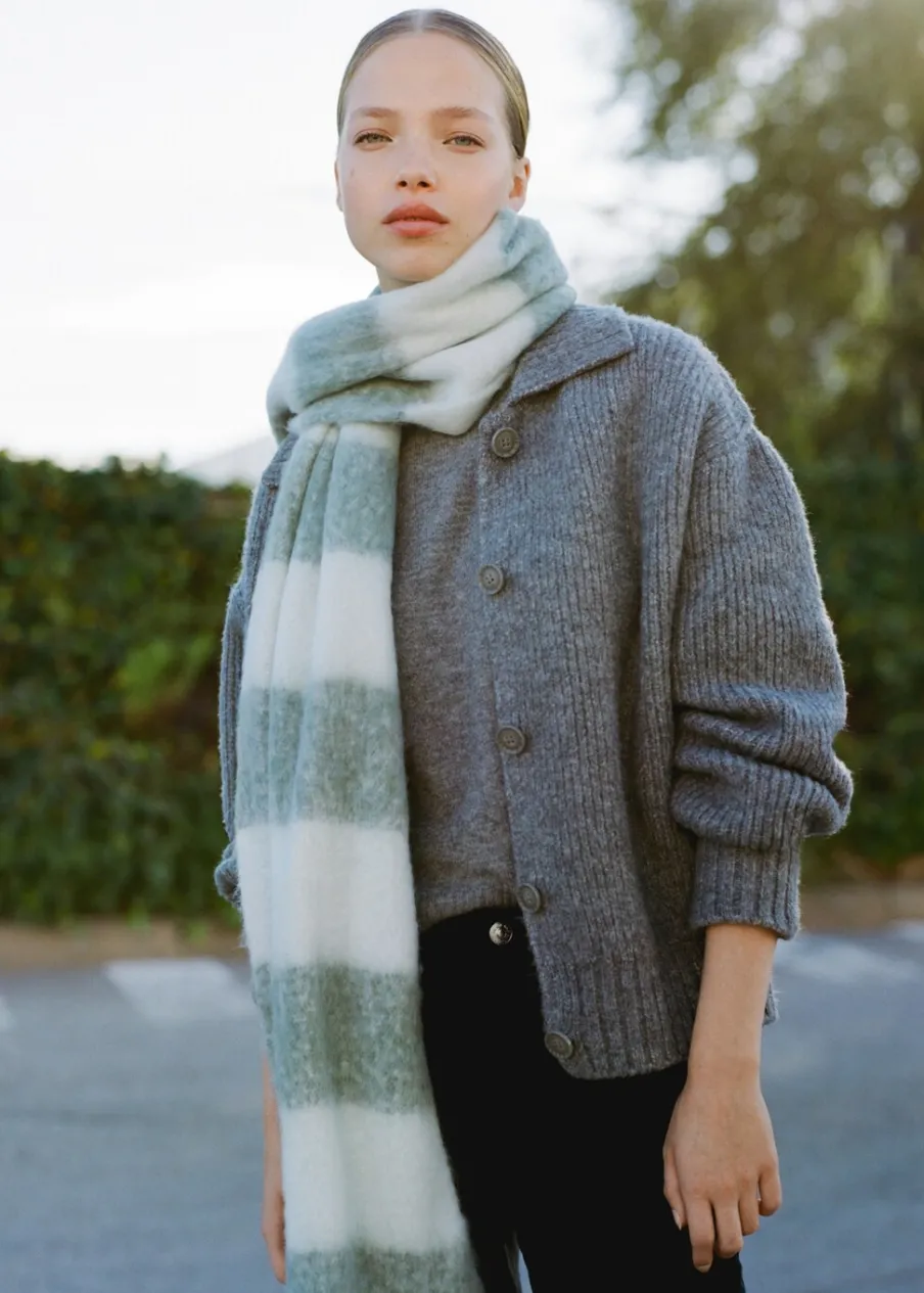Dzianina. Wzór w paski. Dekoracyjne frędzle.